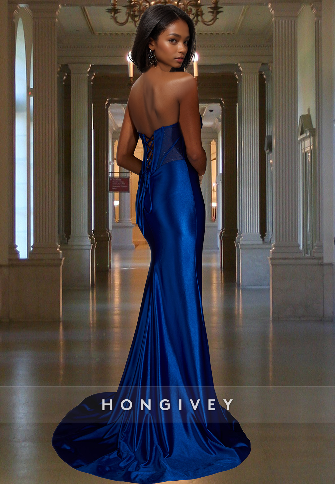 Sexy Ruched with Slit Strapless Blue Trumpet Satin Formal Party Evening Dress