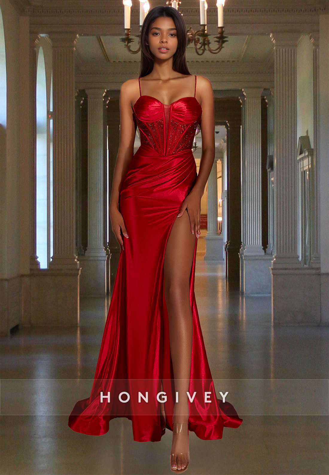 Sexy Sweetheart Straps Slit Red Sequined Satin Formal Party Evening Dress