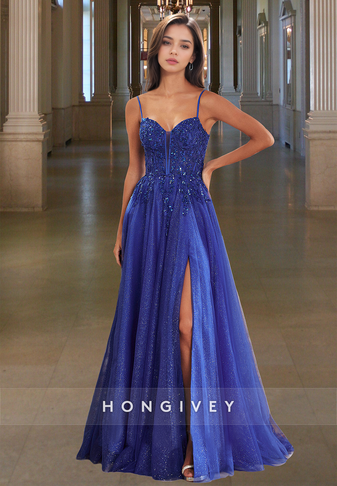 Stunning Applique Blue Spaghetti Straps A-Line Corset Formal Evening Prom Dress