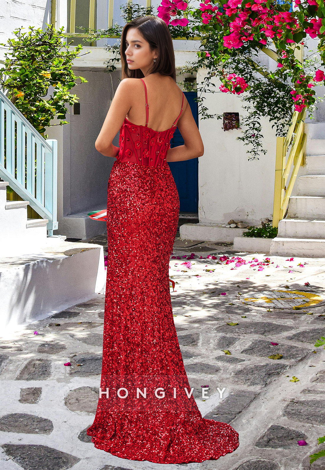 Sparkle Red Spaghetti Straps Applique Sequined with Slit Evening Dress 2025