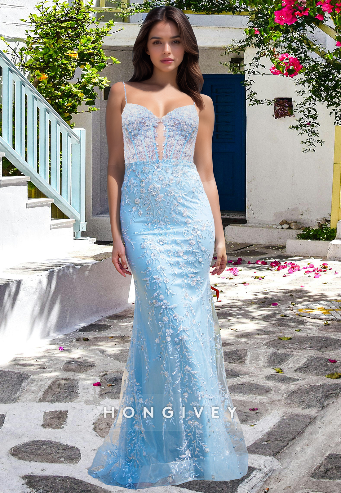 Blue Spaghetti Straps Applique Sweetheart Sheath Floor-Length Evening Dress