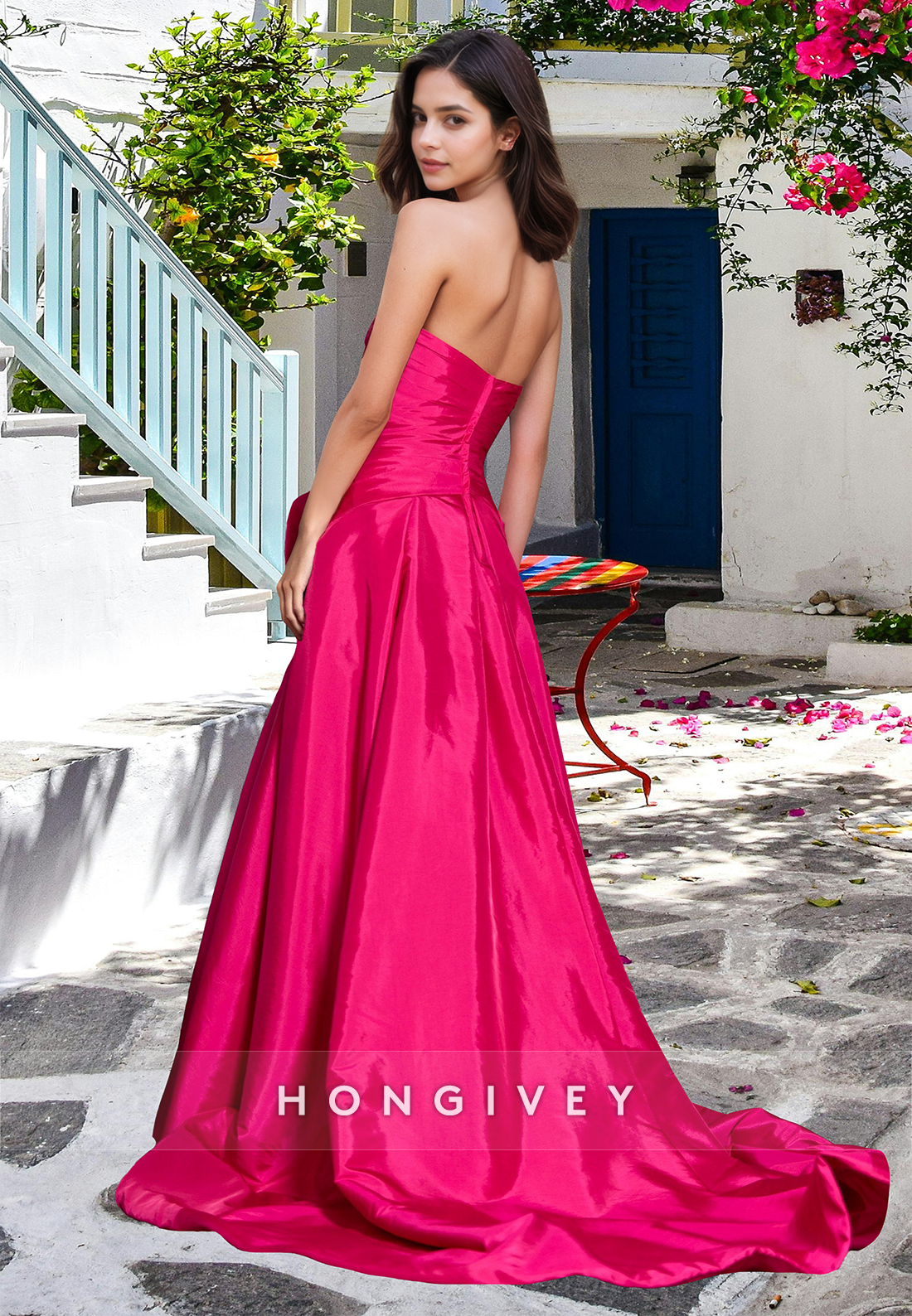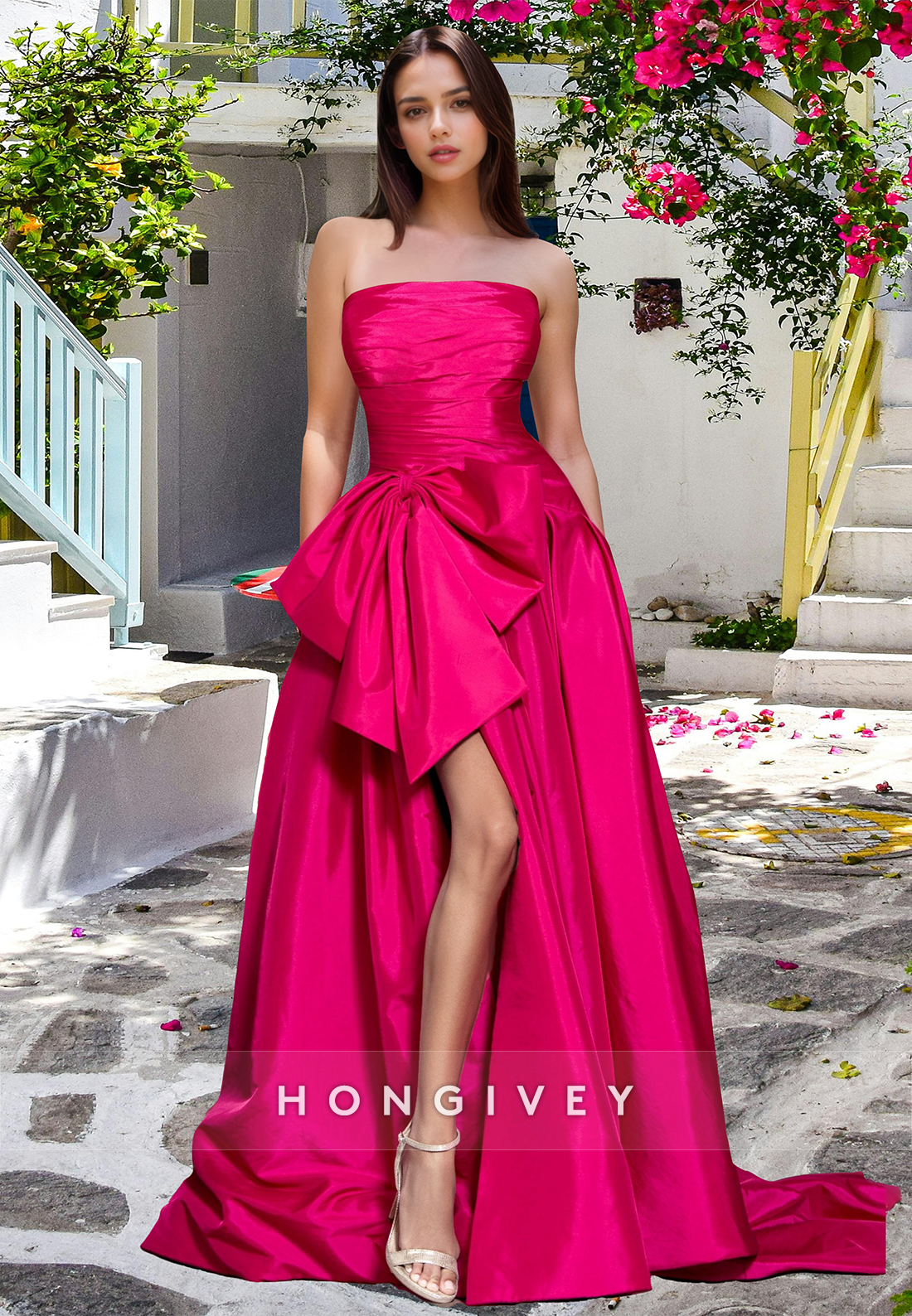 Formal Strapless with Bow A-Line with Slit Evening Dress Party Prom Gown