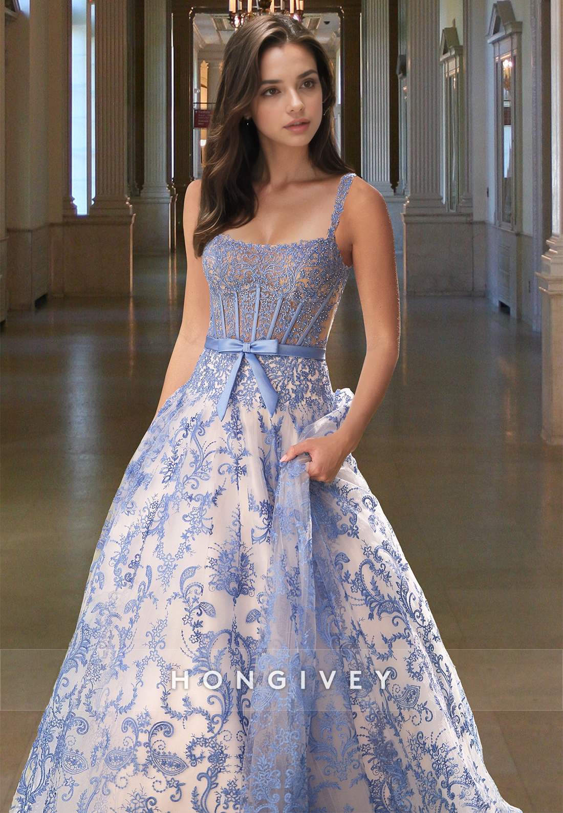 This Special Blue Floral Square Straps A-Line Tulle Pricess Prom Dress Ball Gown combines delicate floral details with a flattering A-Line silhouette. The unique square straps add an elegant touch to this ball gown, making it perfect for any formal occasion. Made with high-quality tulle, this dress is designed to make you feel like a princess.
