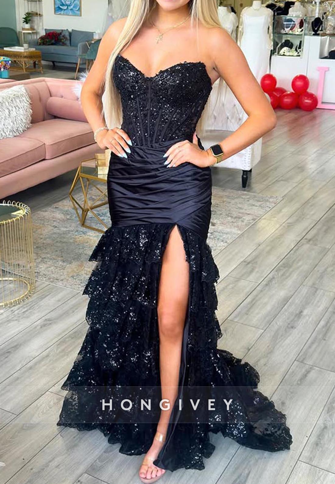 This stunning sweetheart mermaid dress features intricate sequins on luxurious satin fabric, sure to turn heads at any prom or formal event. The figure-flattering split design adds a touch of sophistication and glamour. Elevate your style and make a statement in this must-have dress.