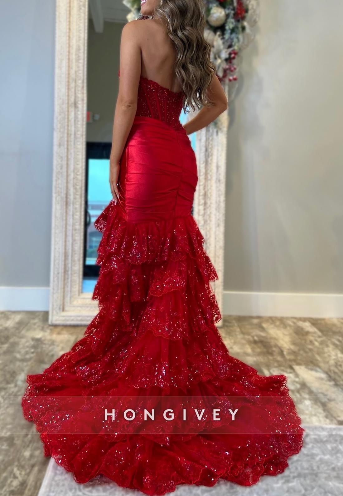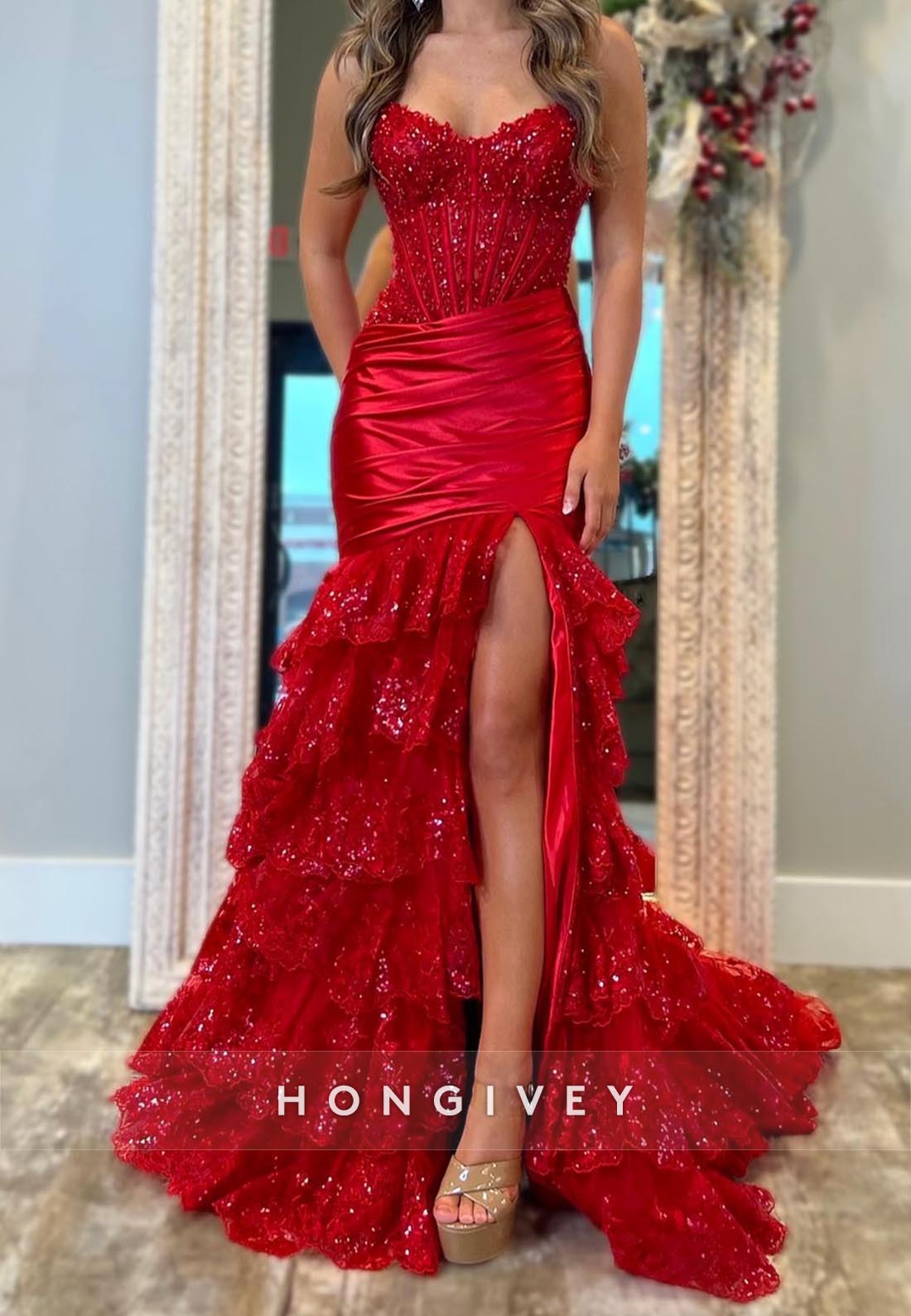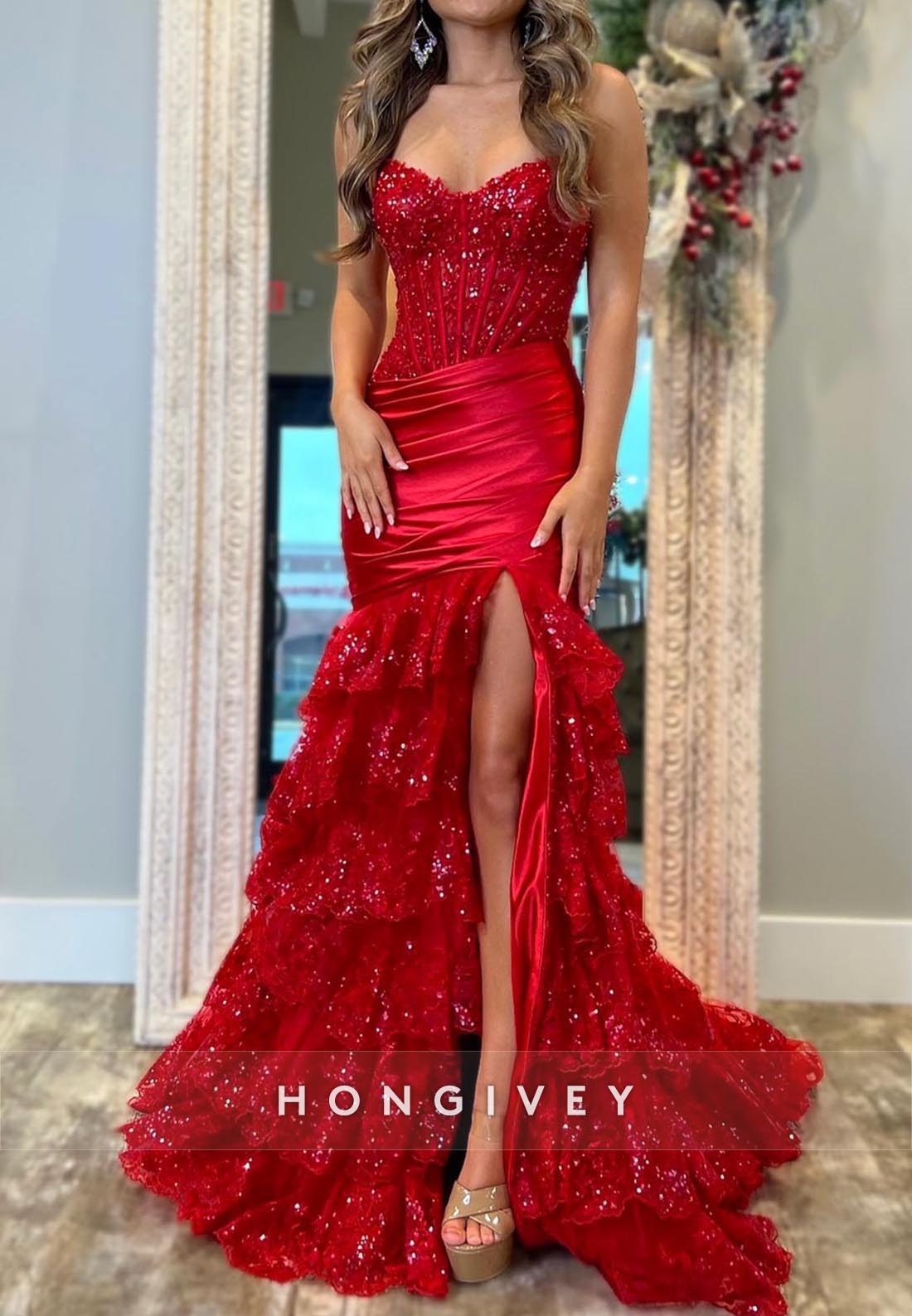 Sweetheart Mermaid Sequins Lace Appliques Satin Prom Dresses with Split