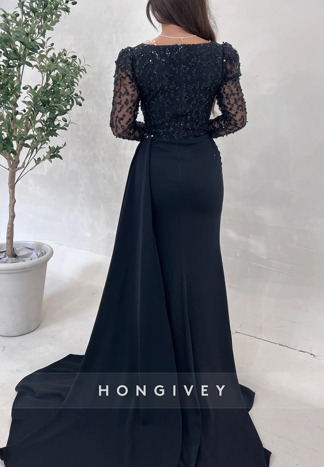 Sheath Sweep Train Long Sleeve Beading Formal Dresses