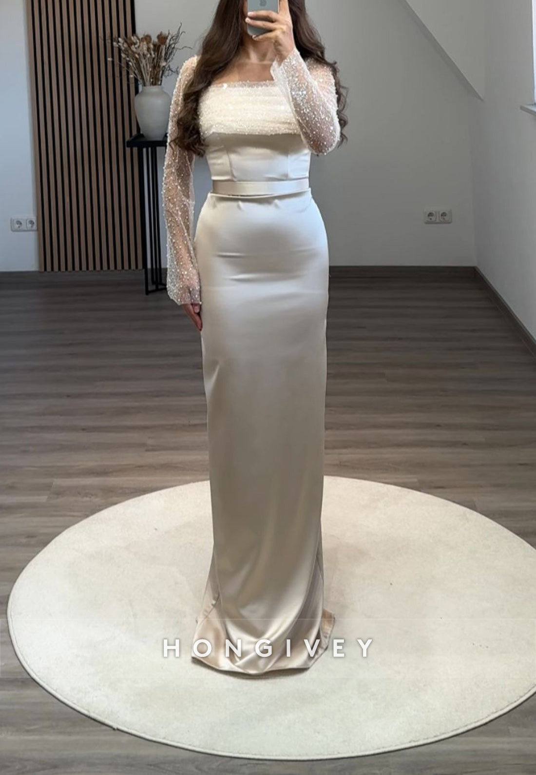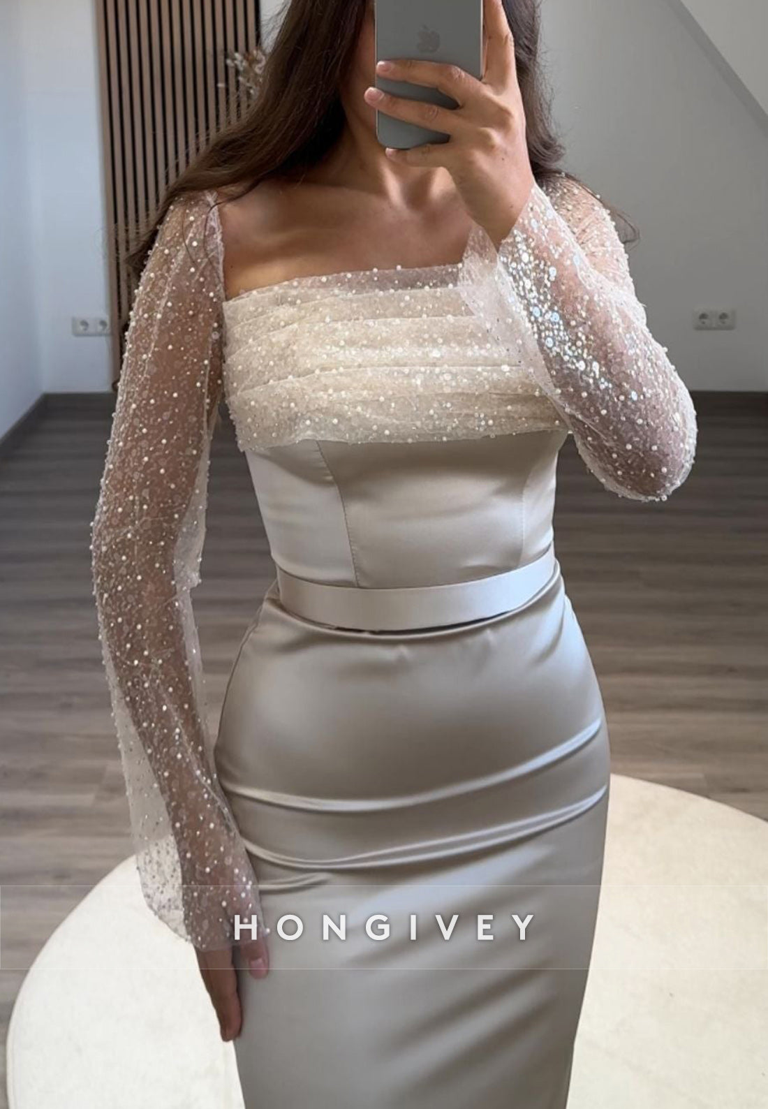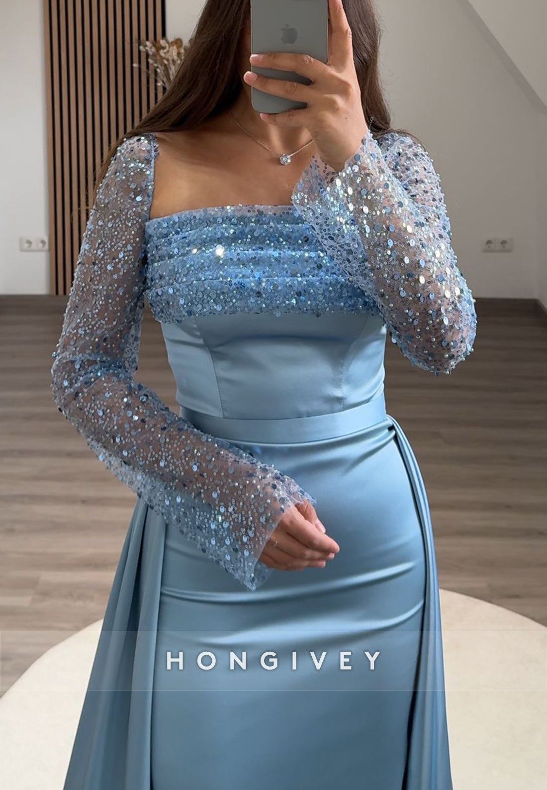 This Formal Long Sleeve Sheath Floor-Length Square Appliqued Pleated Evening Gown is a must-have for any formal event. The long sleeves and floor-length design provide elegant coverage, while the square neckline and appliqued details add a touch of sophistication. The pleated skirt offers a flattering silhouette, making you stand out in any crowd. Perfect for a timeless and chic look.