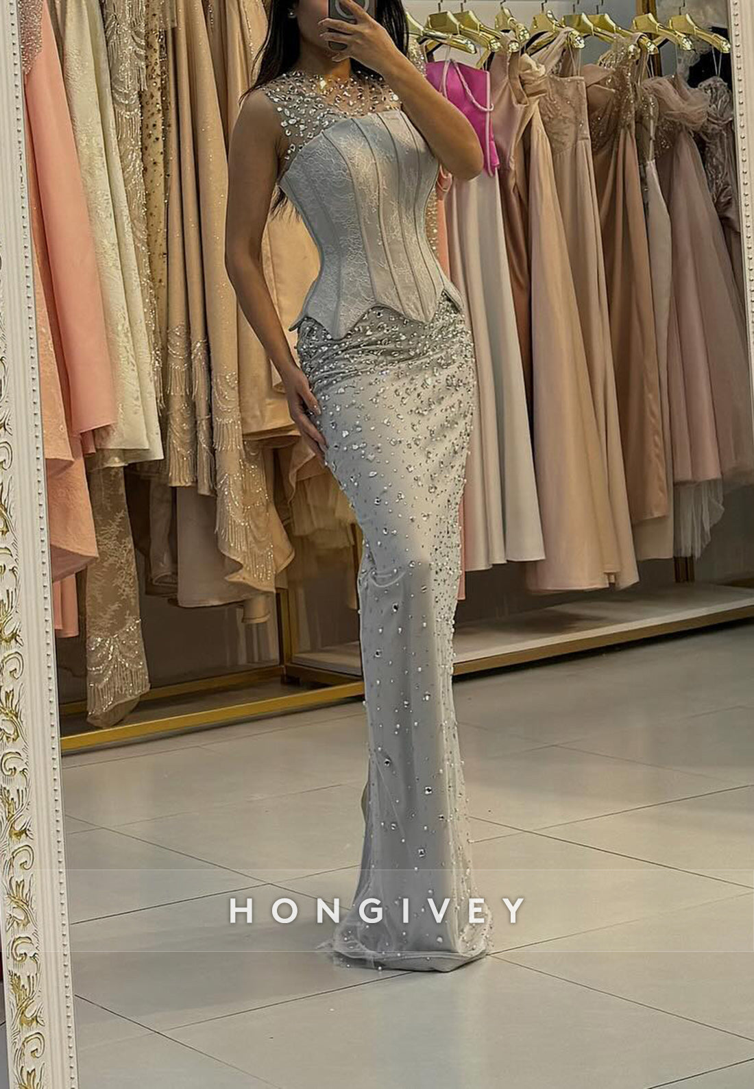 Appliqued Mermaid Floor-Length Halter Sleeveless Rhinestone Evening Gown