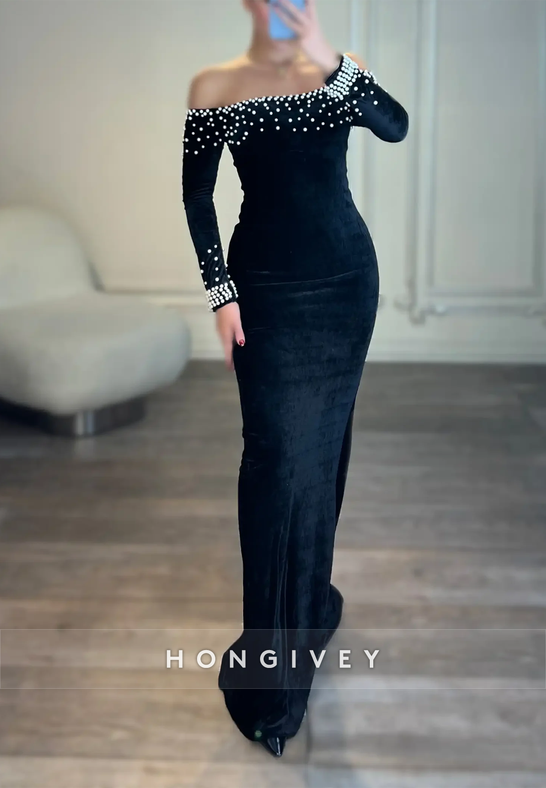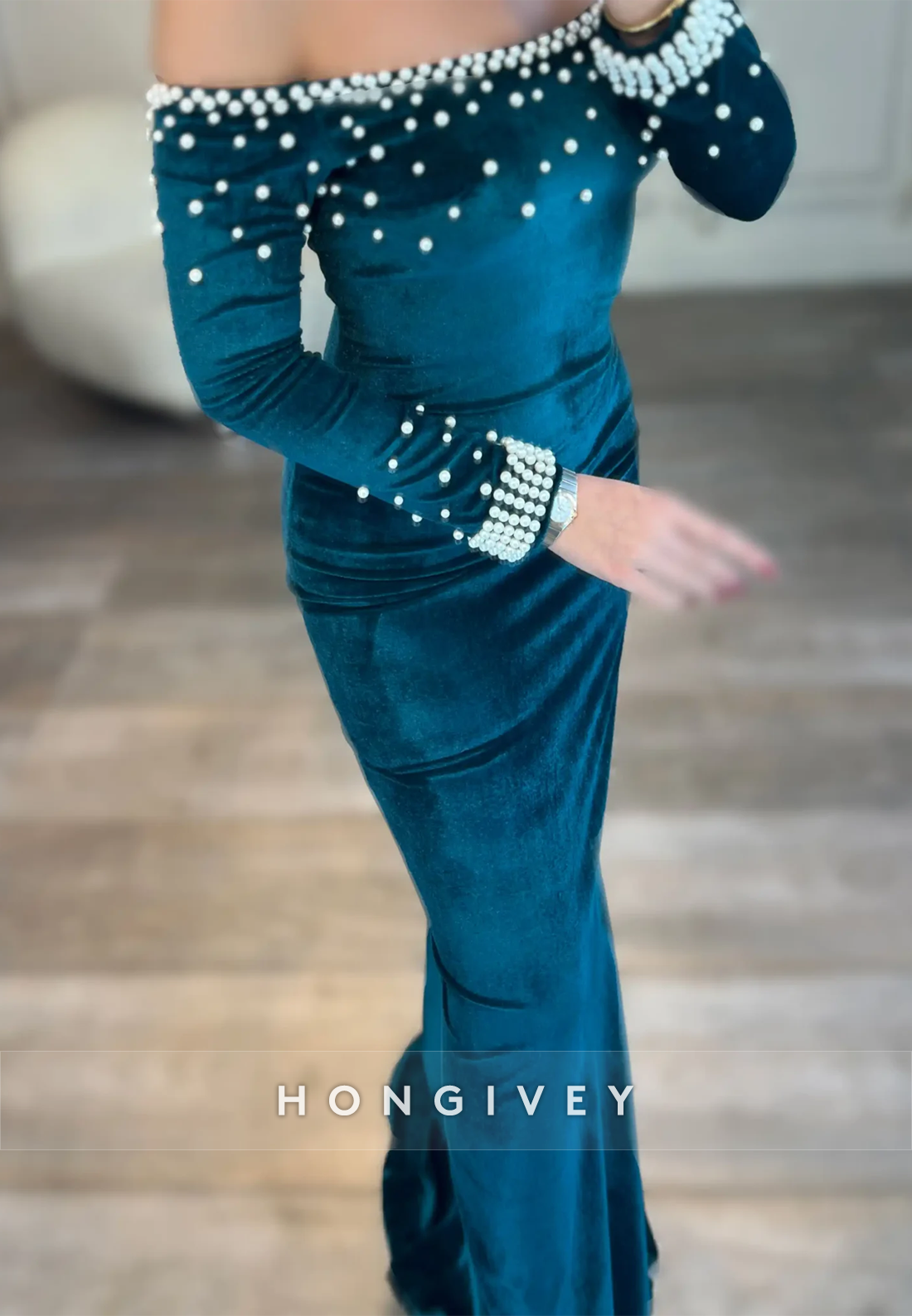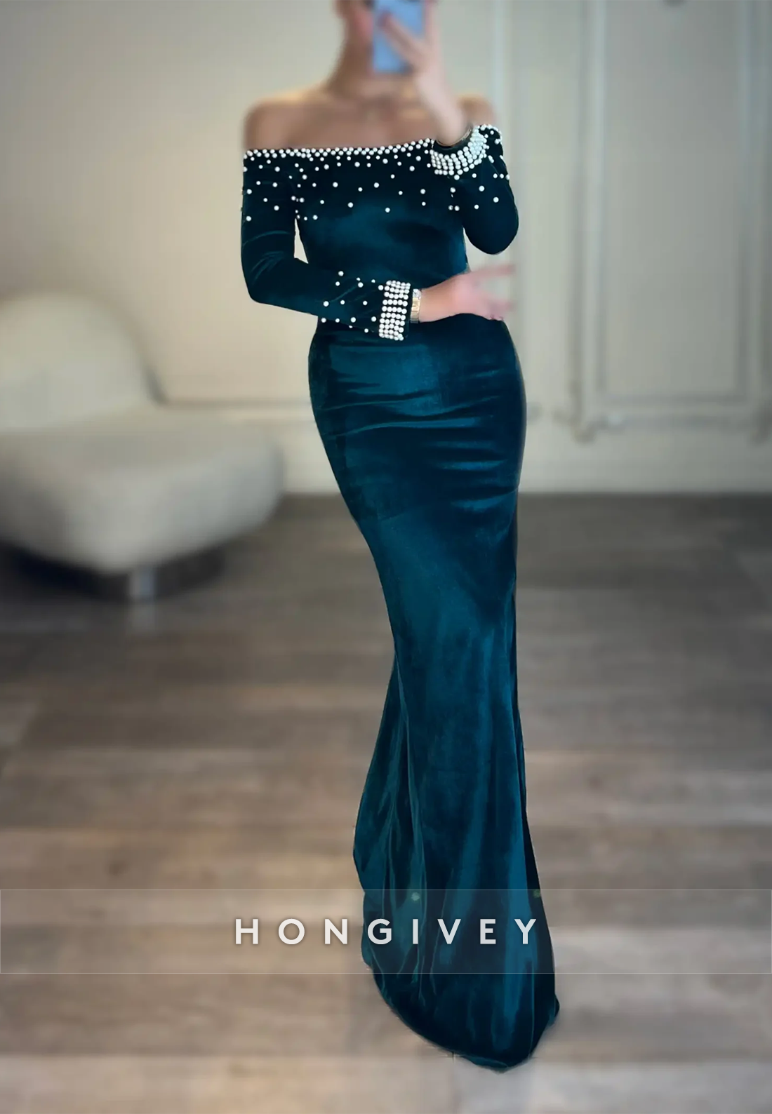 Appliqued Sweep Train Off the Shoulder Satin Long Sleeve Evening Gown