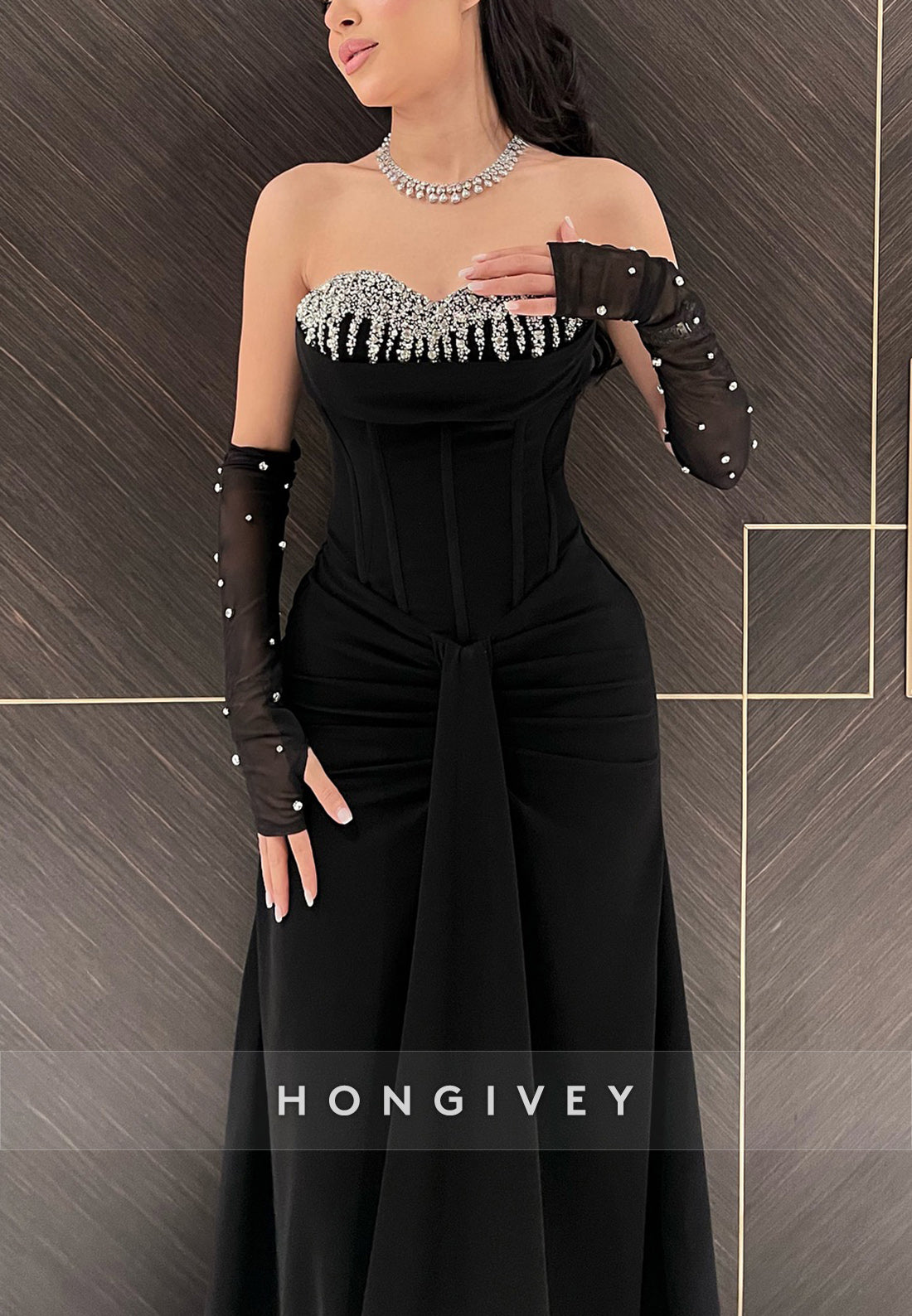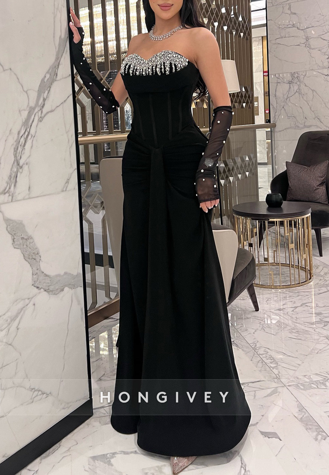 Column Floor-Length Sweetheart Pleated Beaded Rhinestone Evening Gown
