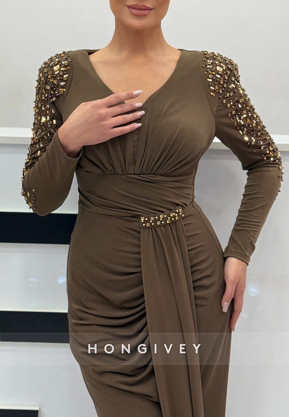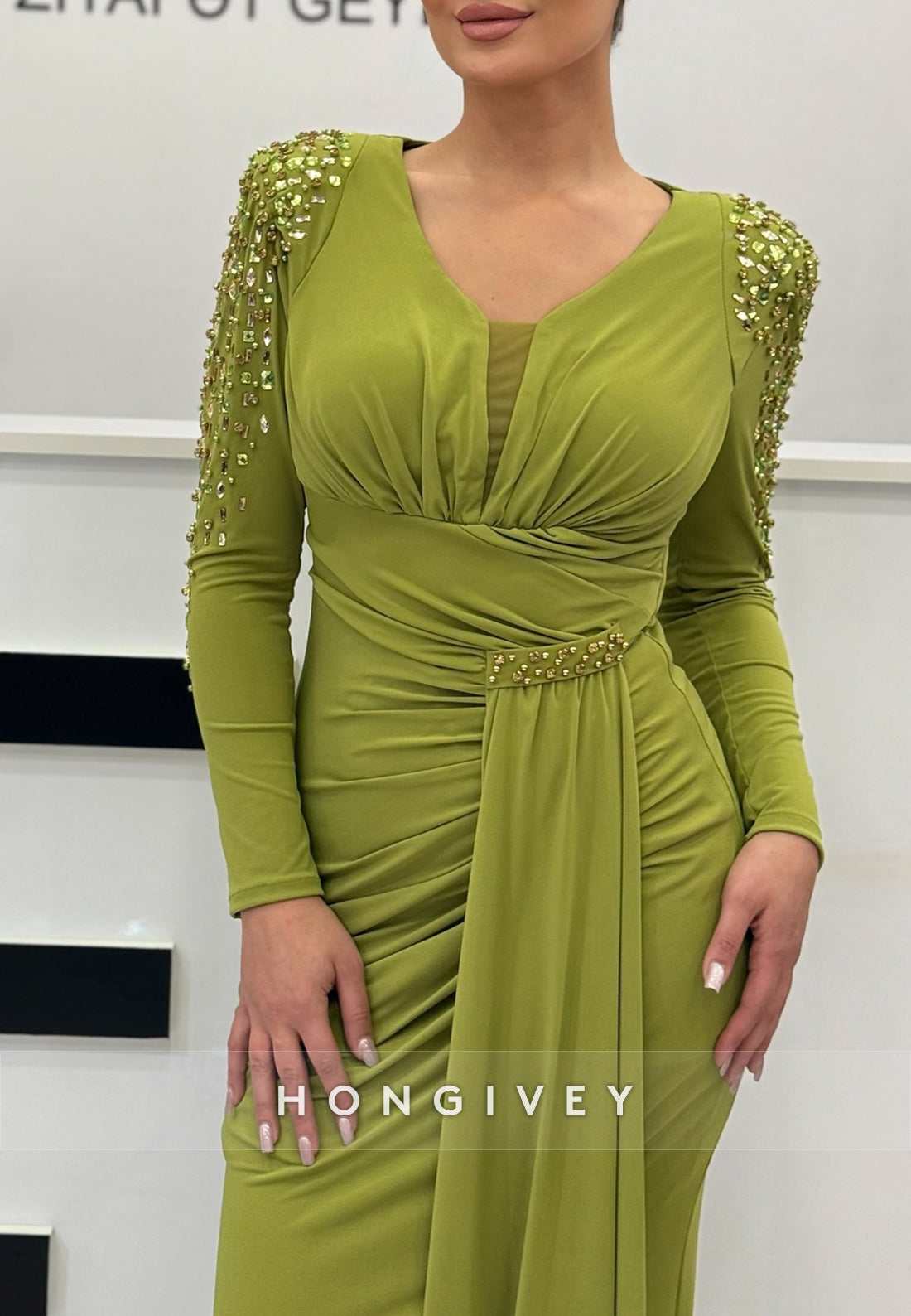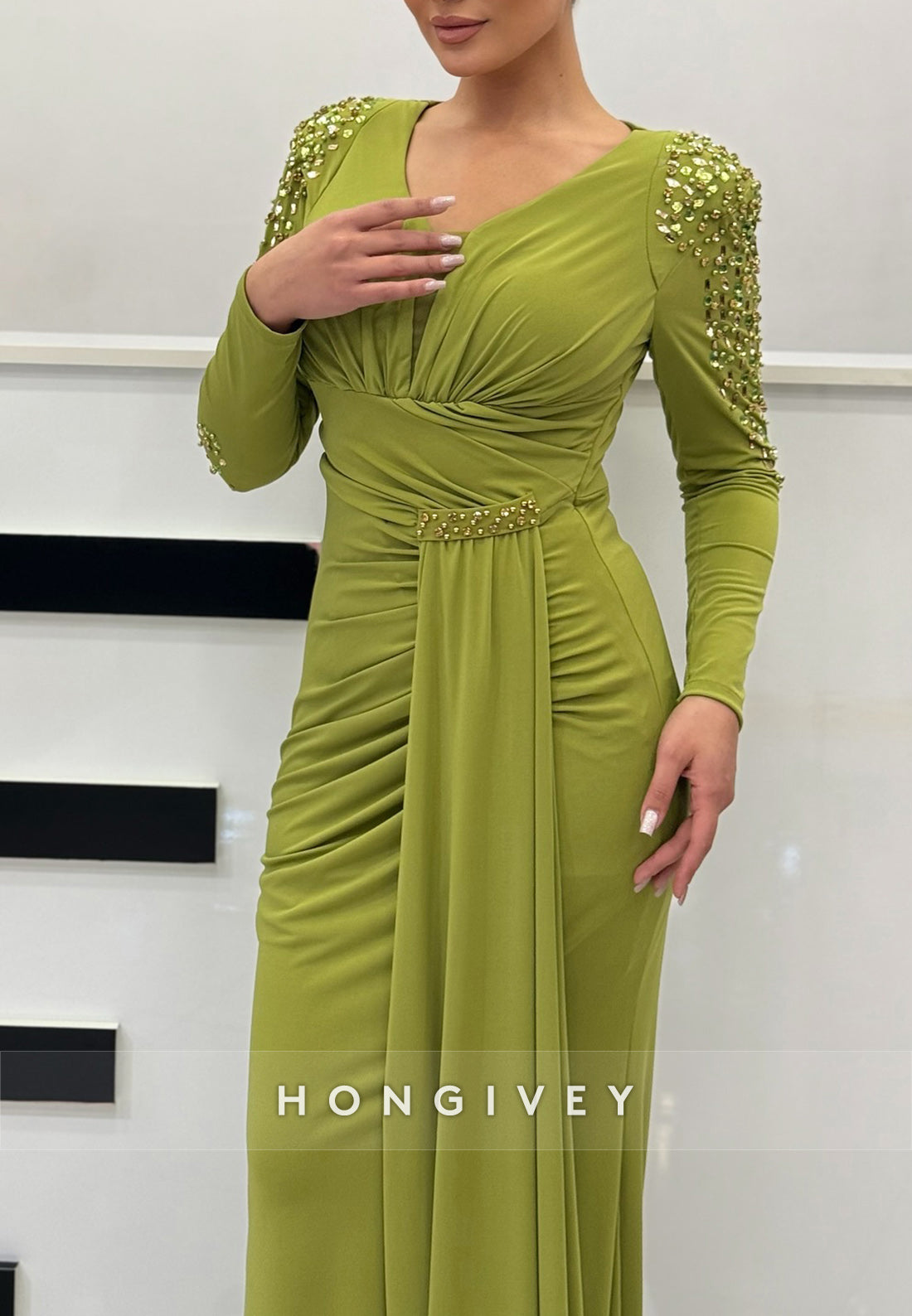 Column Sweep Train Long Sleeve Pleated with slit Rhinestone Evening Gown