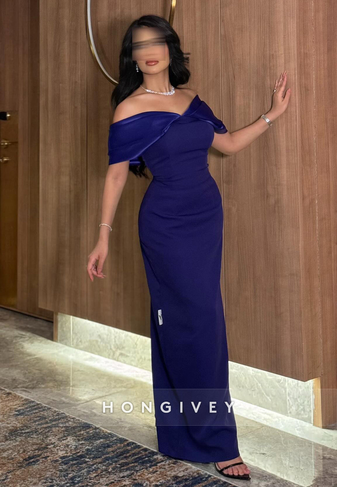 Off the Shoulder Floor-Length Column Satin Pleated Low Back Evening Gown