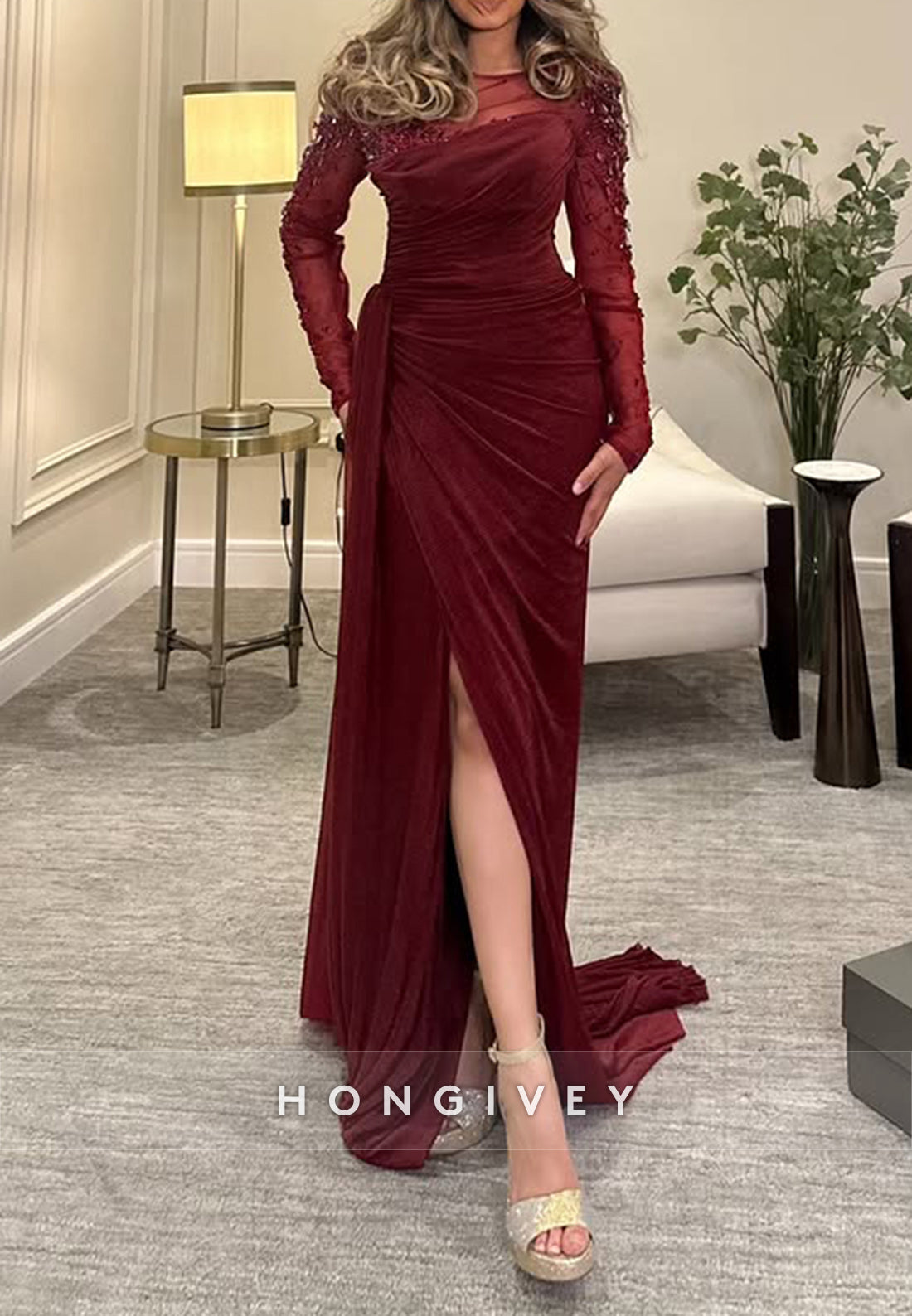 Sheath Court Train Illusion Neck Long Sleeve Pleated Side Slit Evening Gown