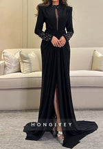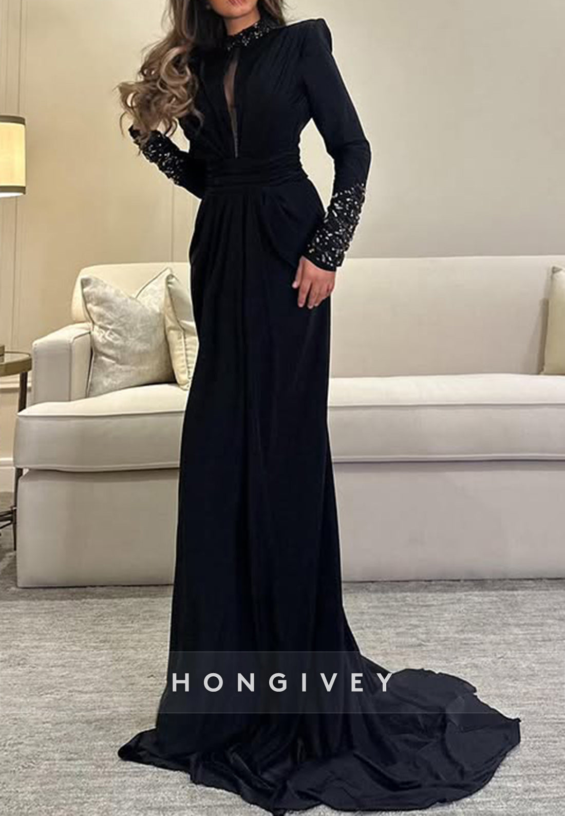 Black Long Sleeve High Neck Sheath Side Slit Pleated Evening Gown