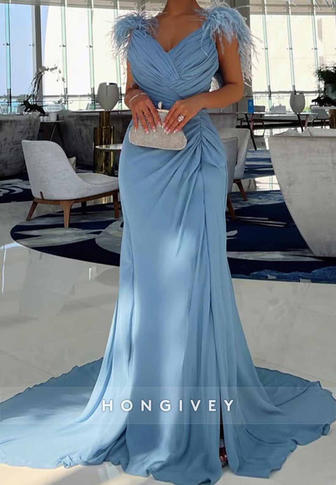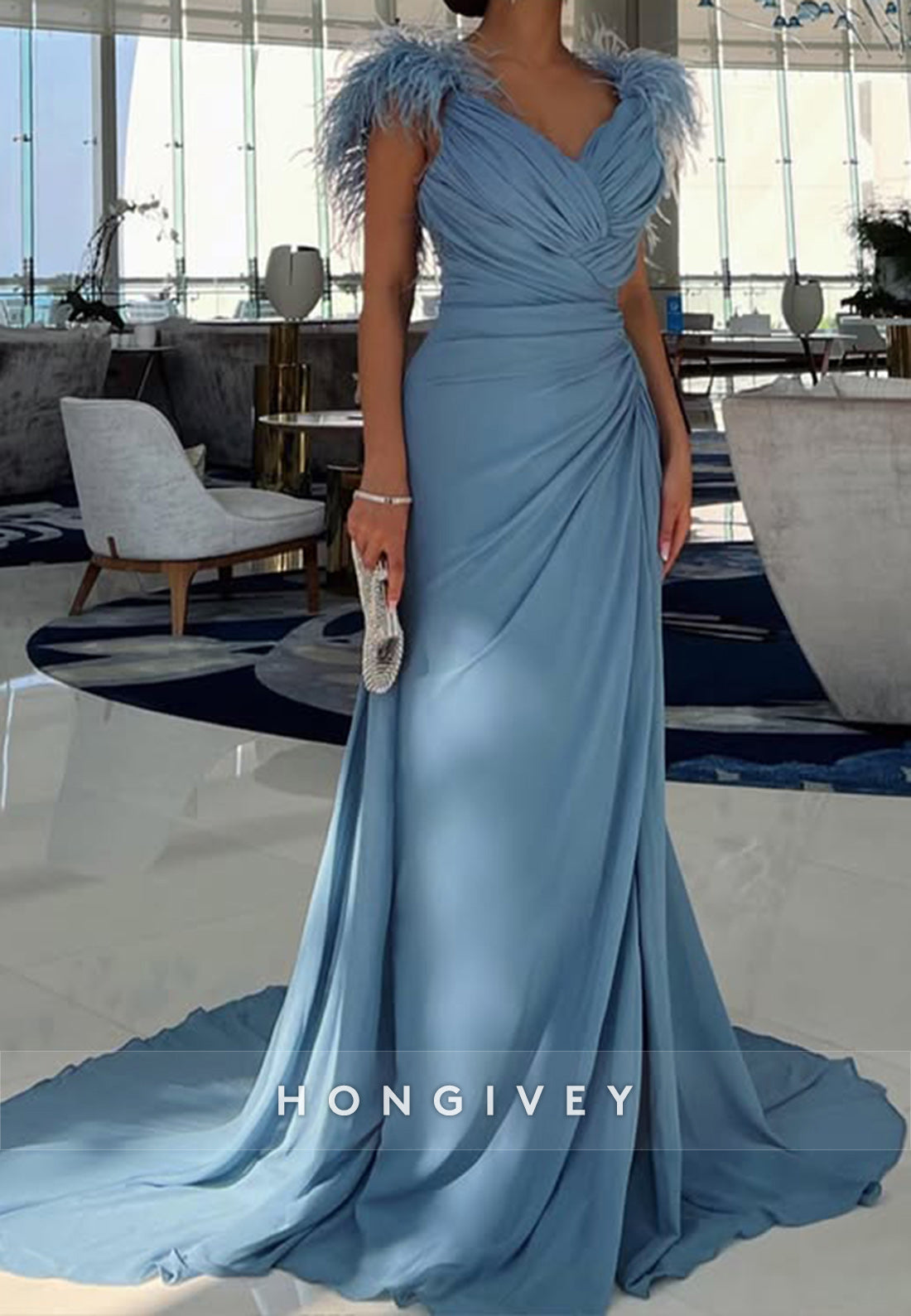 Sky Blue Sheath Court Train V Neck Cap Sleeves Pleated Feather Evening Gown