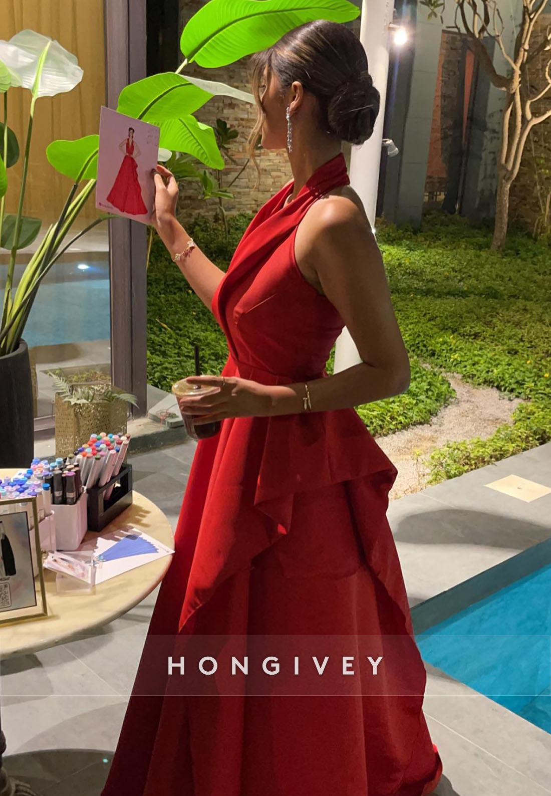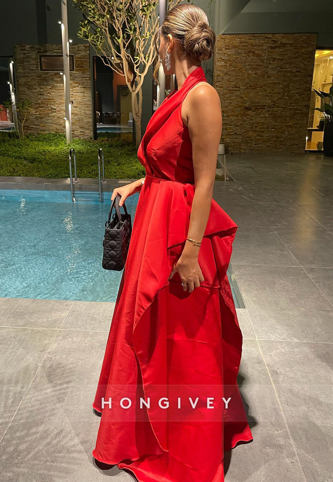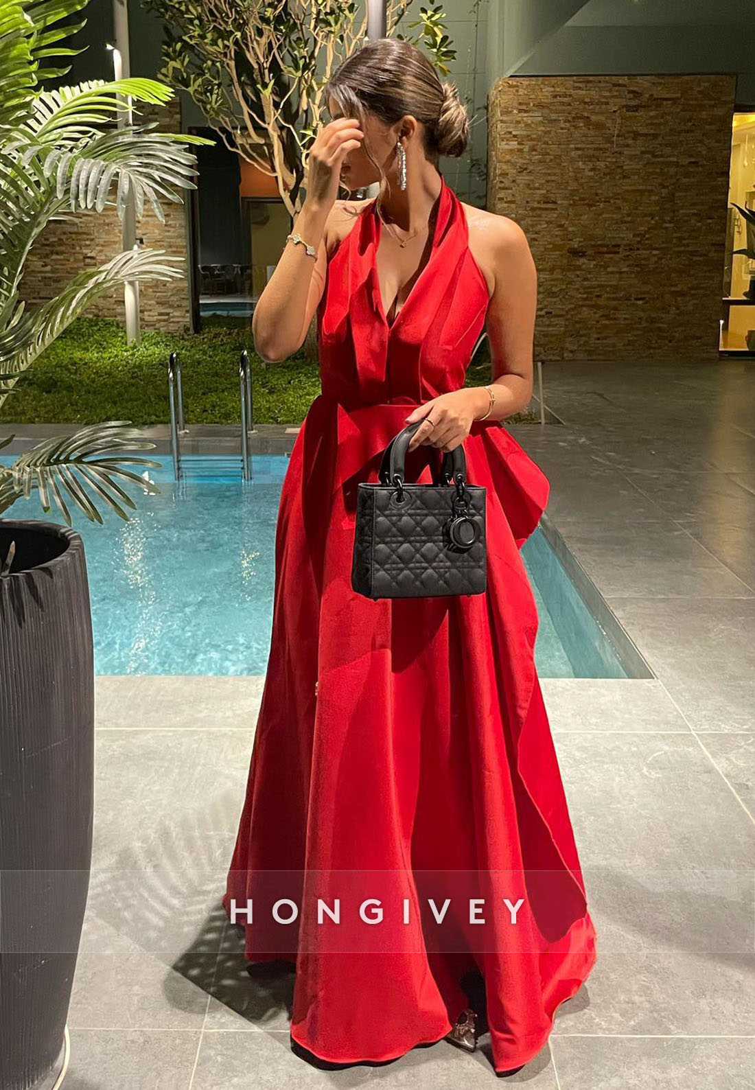 Red V Neck Halter Off the Shoulder Floor-Length Evening Gown