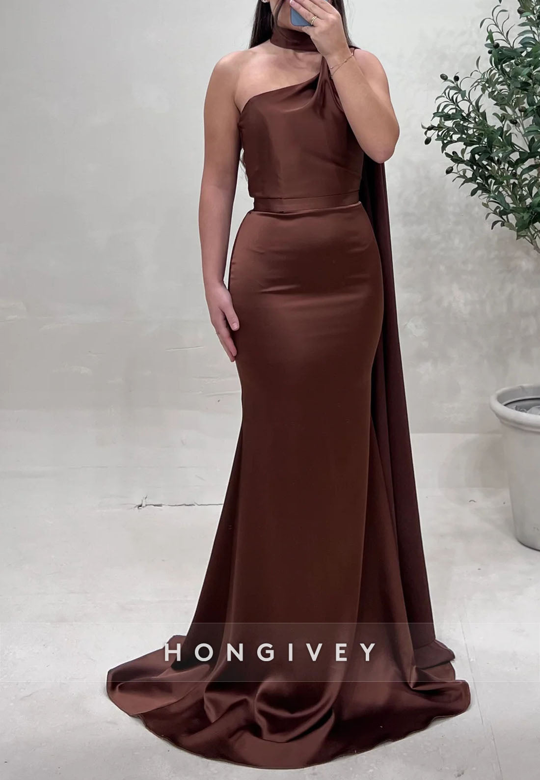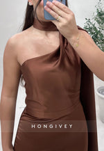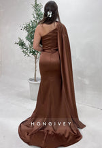 Pleated Side Draping Satin Sweep Train Evening Gown Trumpet Formal Dresses