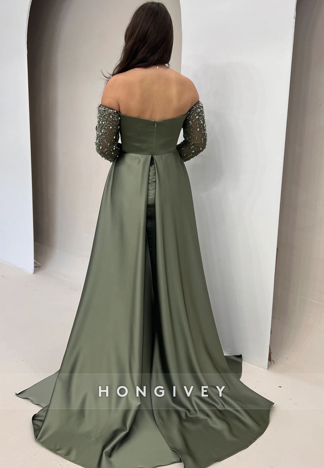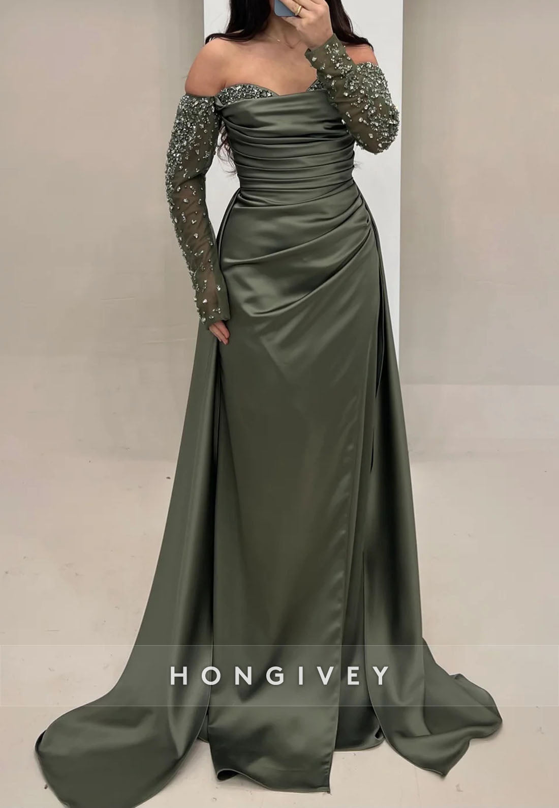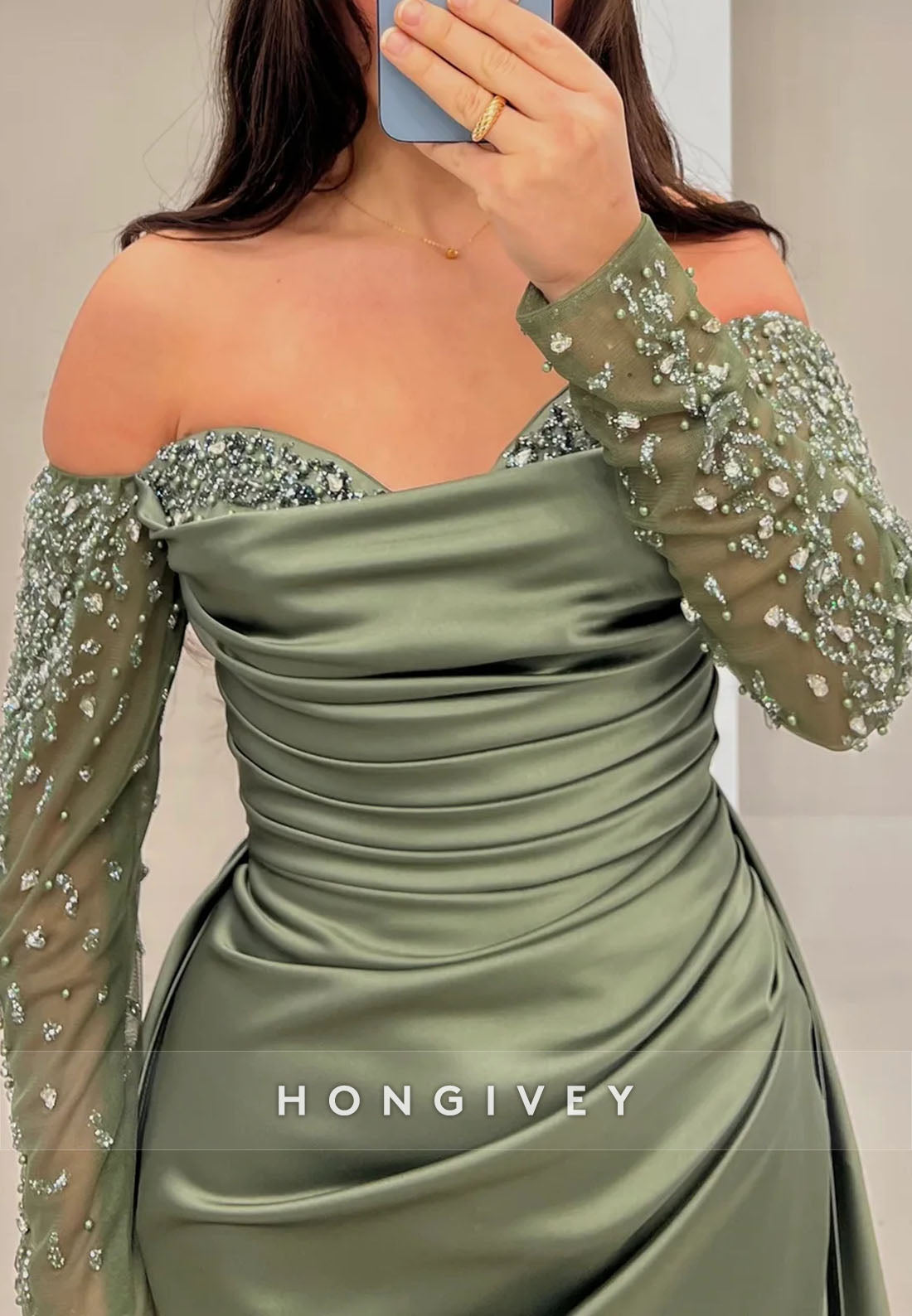 Satin Off the Shoulder Pleated Beading Long Sleeve Sweep Train Column Evening Gown