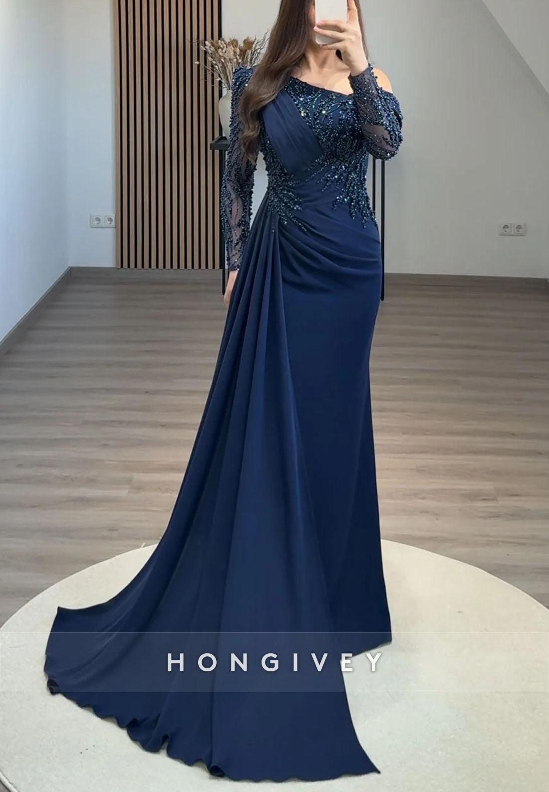 Side Draping Column Evening Gown Floor-Length One Shoulder Long Sleeve Beading Formal Dresses
