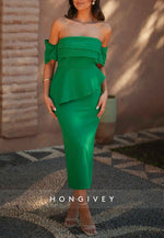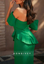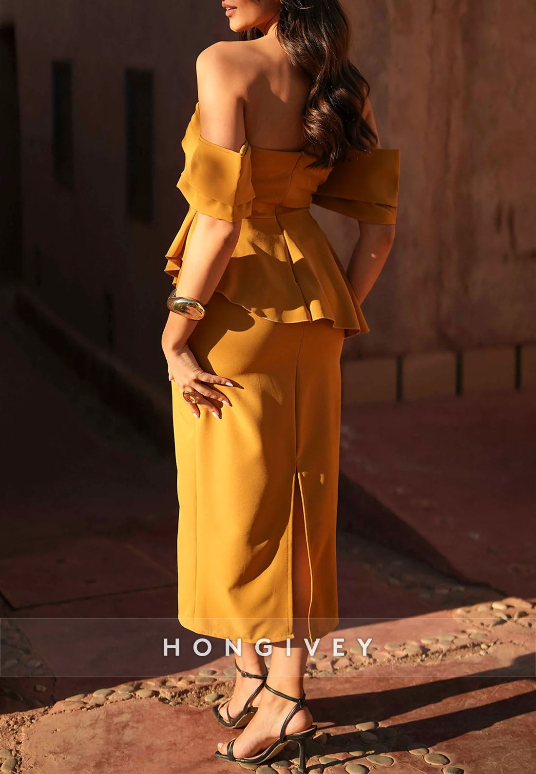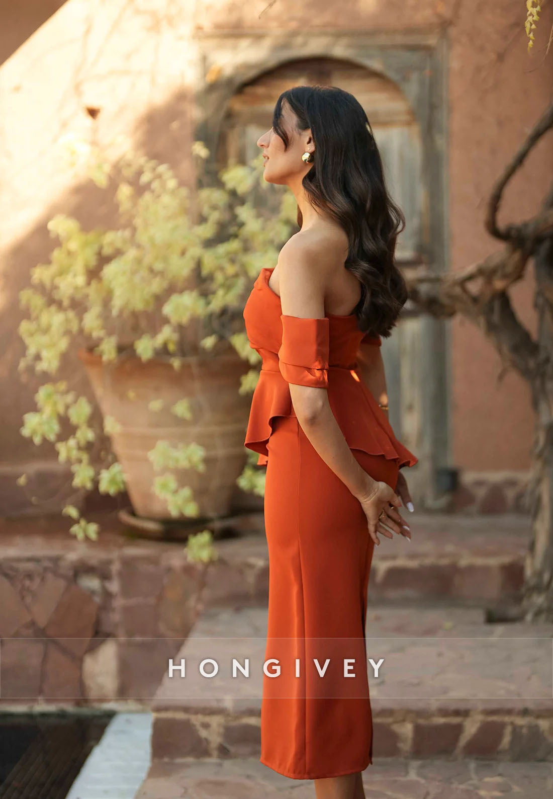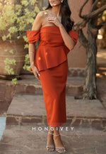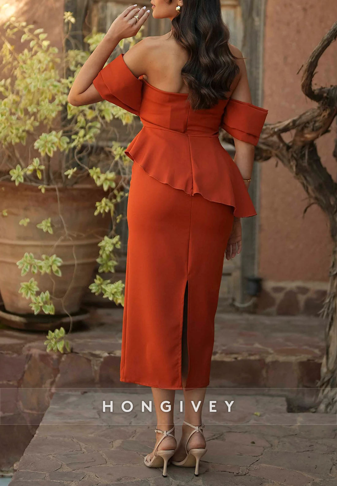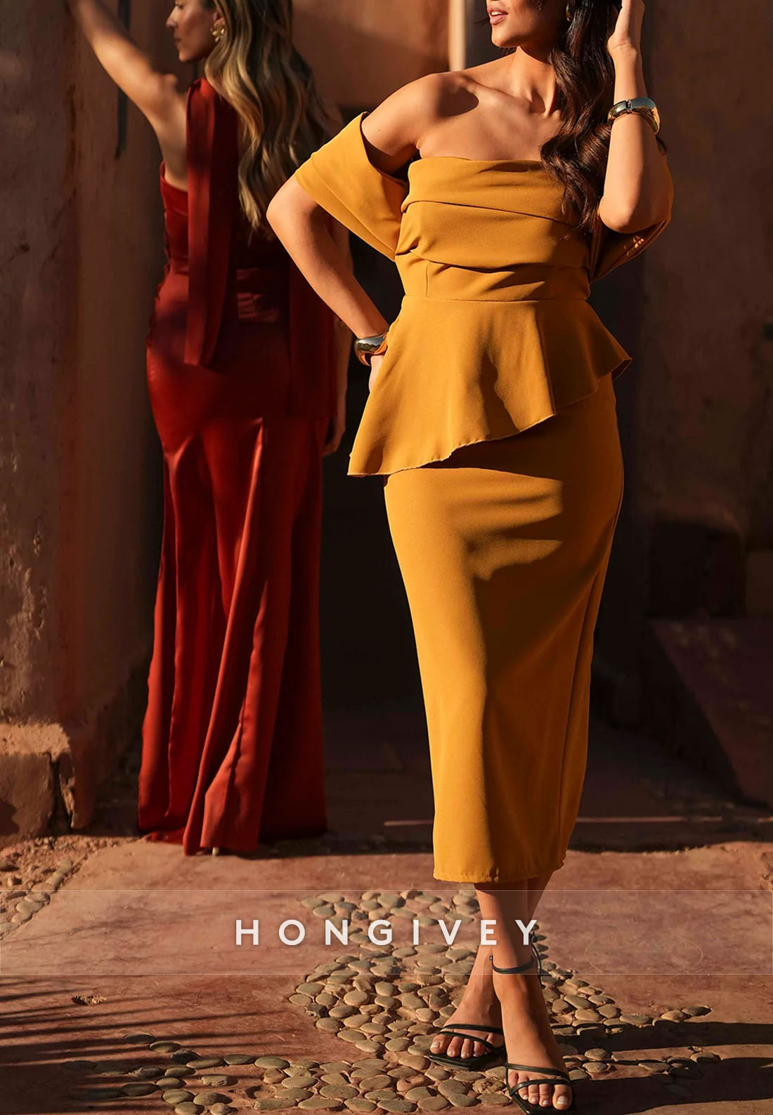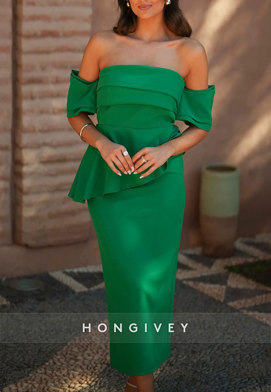 Off the Shoulder Sheath Mother of the Bride Dress Tea-Length Pleated Evening Gown