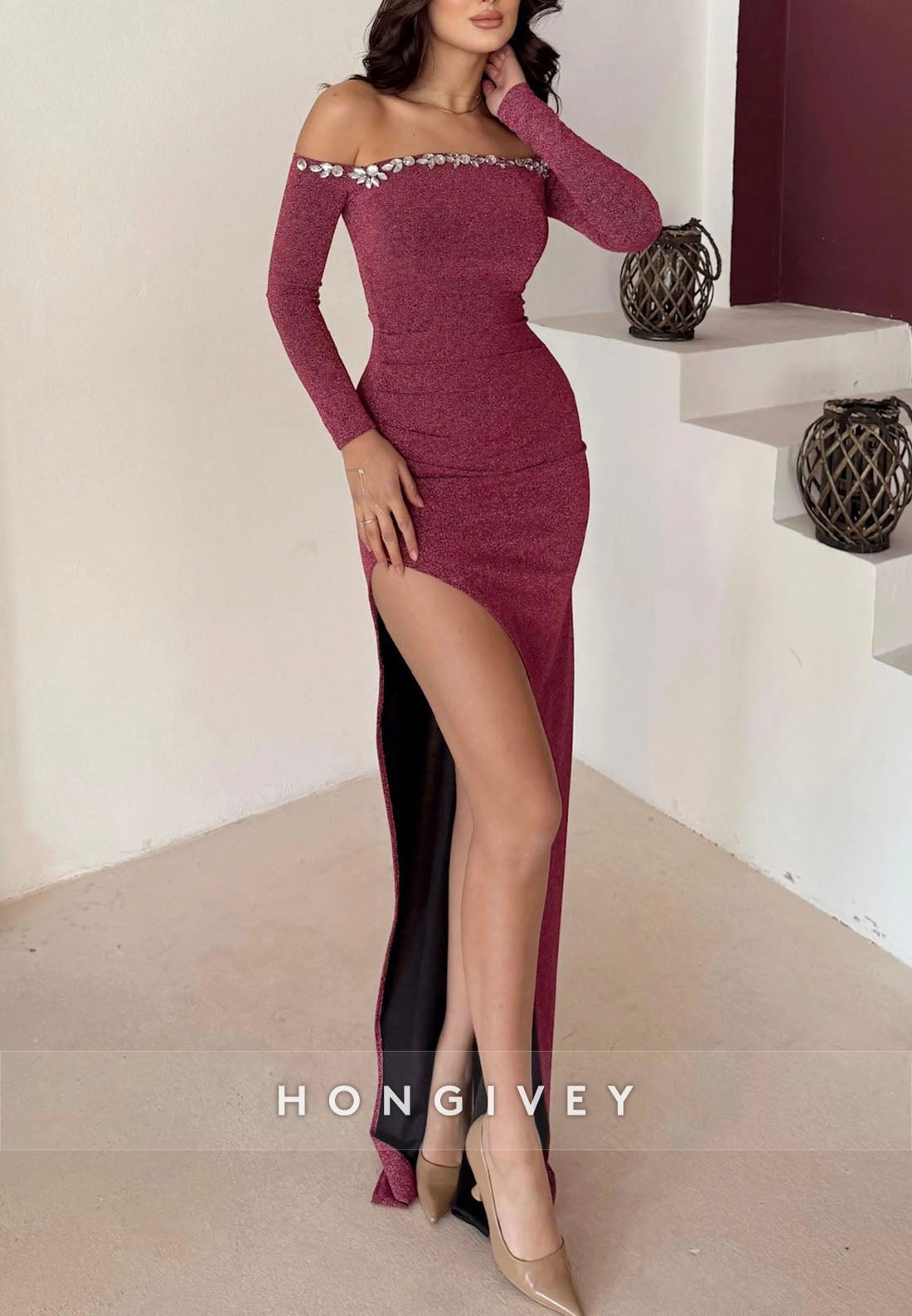 High Slit Long Sleeve Off the Shoulder Floor-Length Pleated Rhinestone Evening Gown