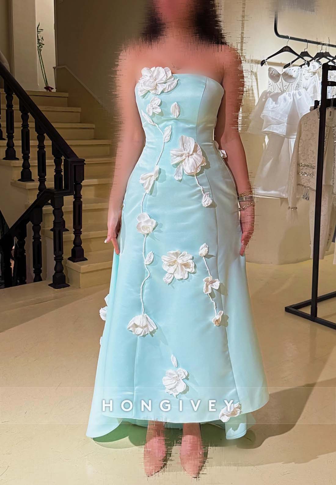 Handmade Flowers Pleated Strapless Ankle-Length A-line Low Back Evening Gown