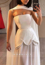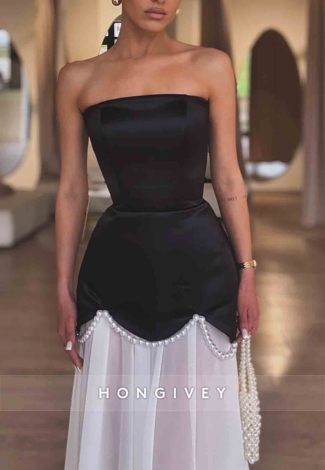 Take center stage in this stunning Strapless A-line Floor-Length Pearls Low Back Pleated Evening Gown. The elegant A-line silhouette flatters your figure while the pearls add a touch of sophistication. The low back and pleated detailing create a luxurious and alluring look. Perfect for a glamorous evening event.