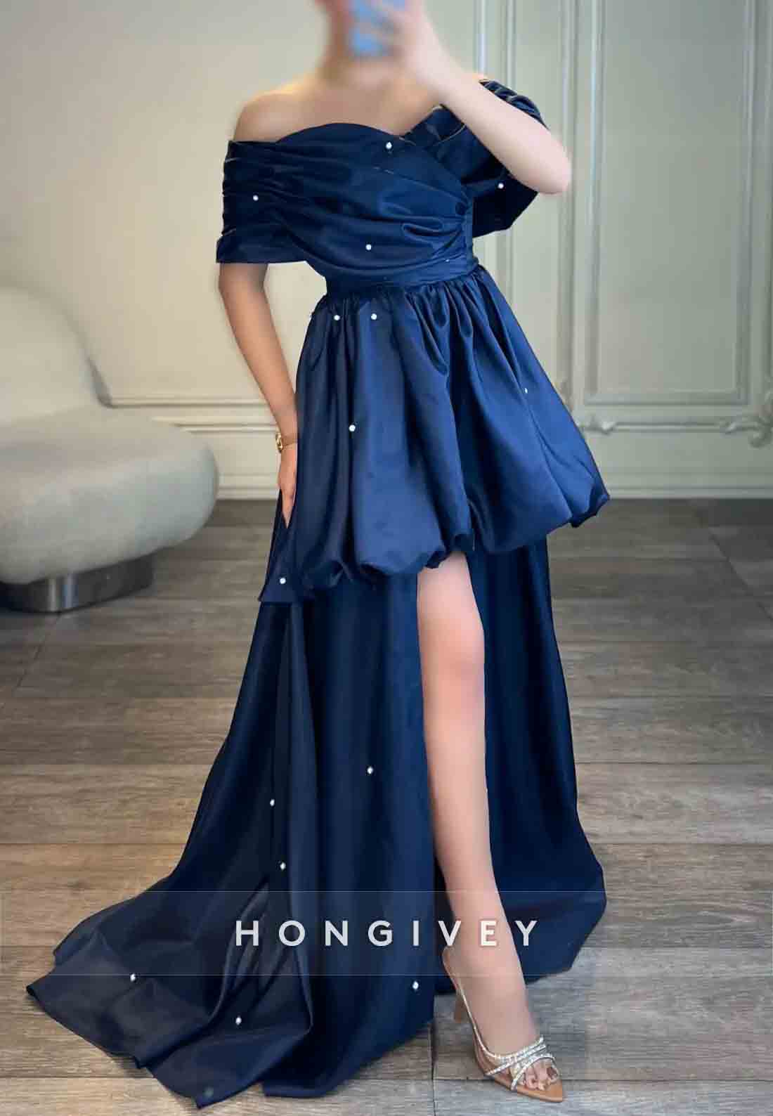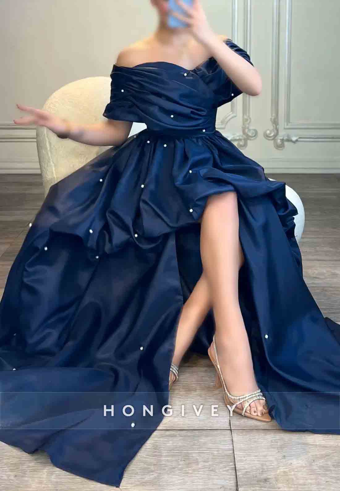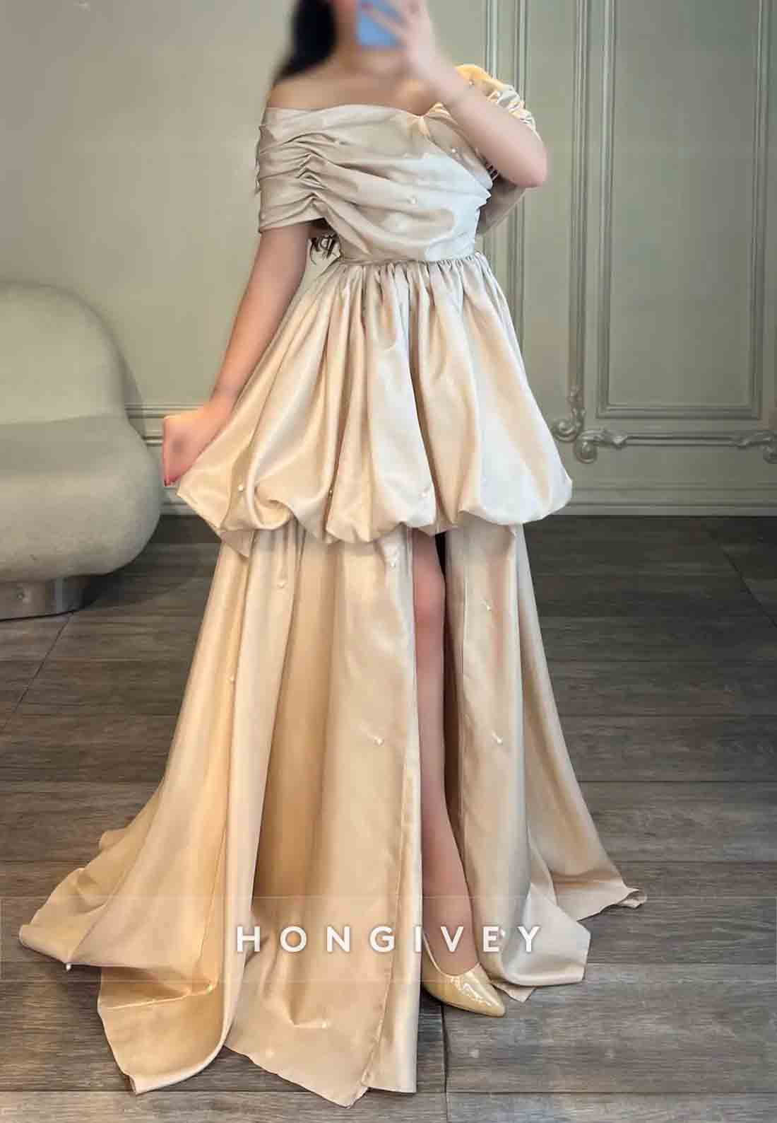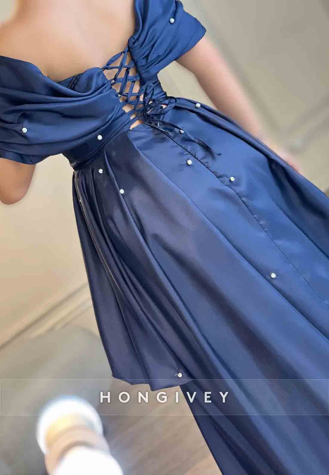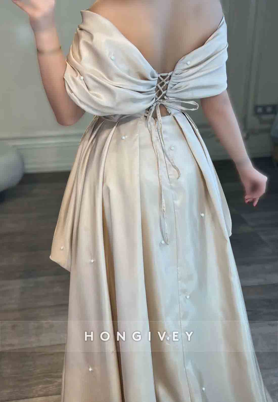 Tie Back A-line Sweep Train Off the Shoulder Pleated Evening Gown