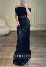 Off the Shoulder Glitter Formal Dresses Floor-Length Pleated Trumpet Evening Gown
