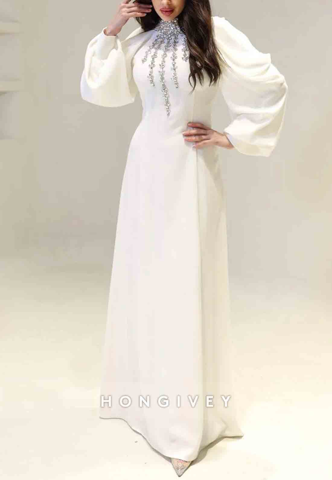 Long Sleeve Evening Gown Appliqued High Neck Empire Formal Dresses A-line Floor-Length