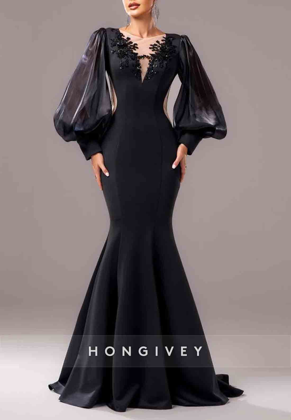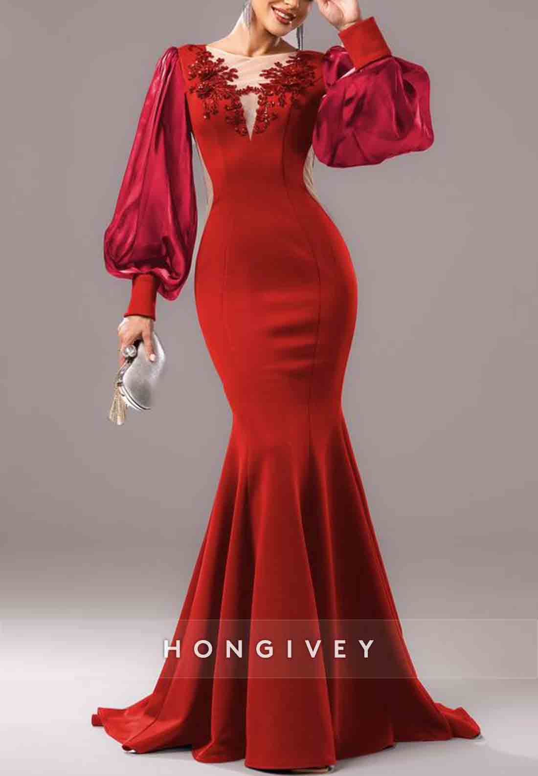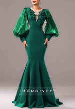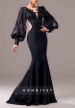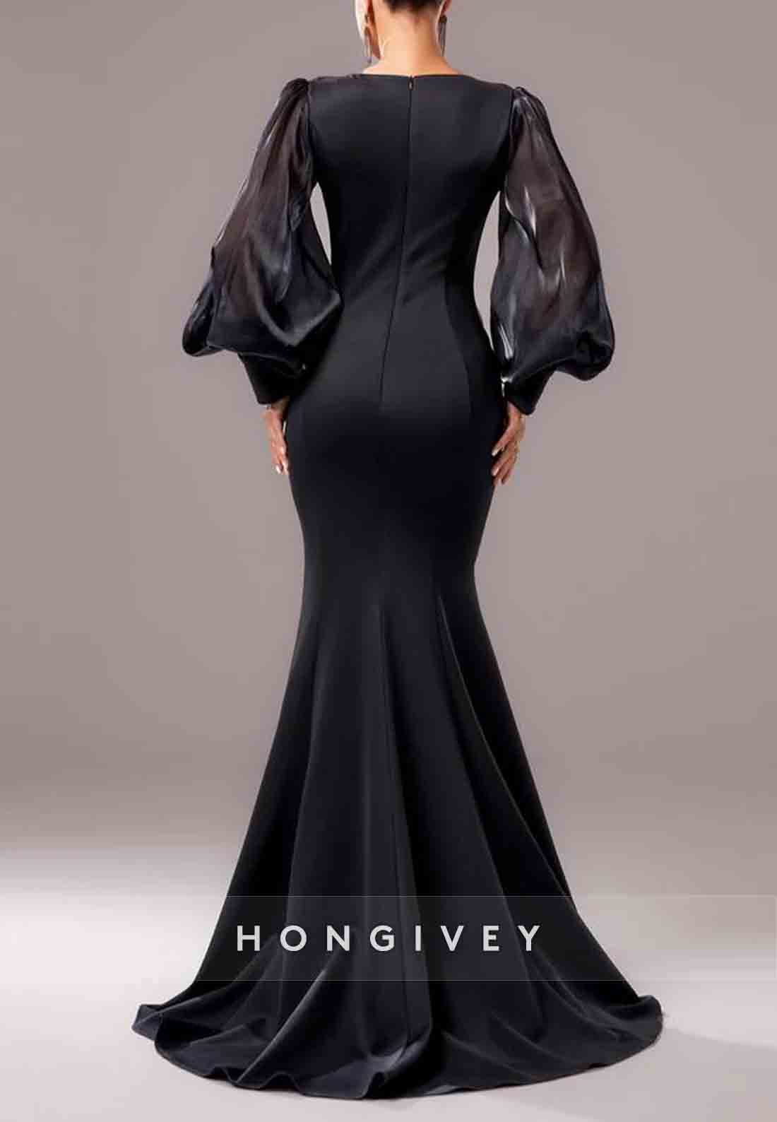Mermaid Evening Gown Floor-Length Illusion Neck Bell Sleeves Pleated Formal Dresses