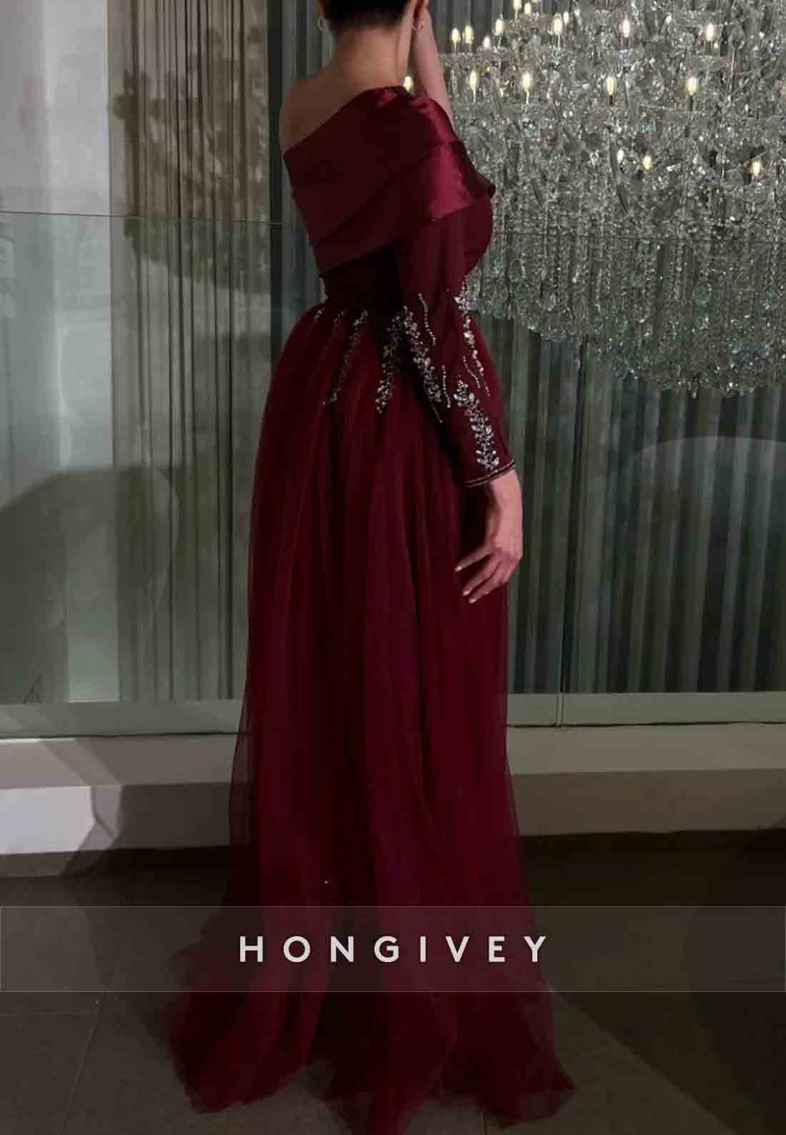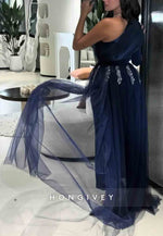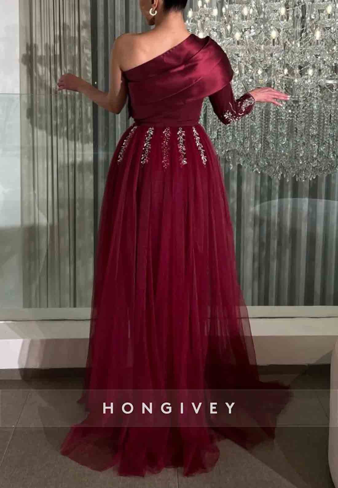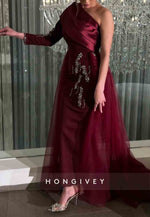 A-line Tulle Long Sleeve Formal Dresses One Shoulder Pleated Appliqued Evening Gown