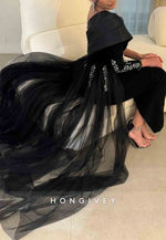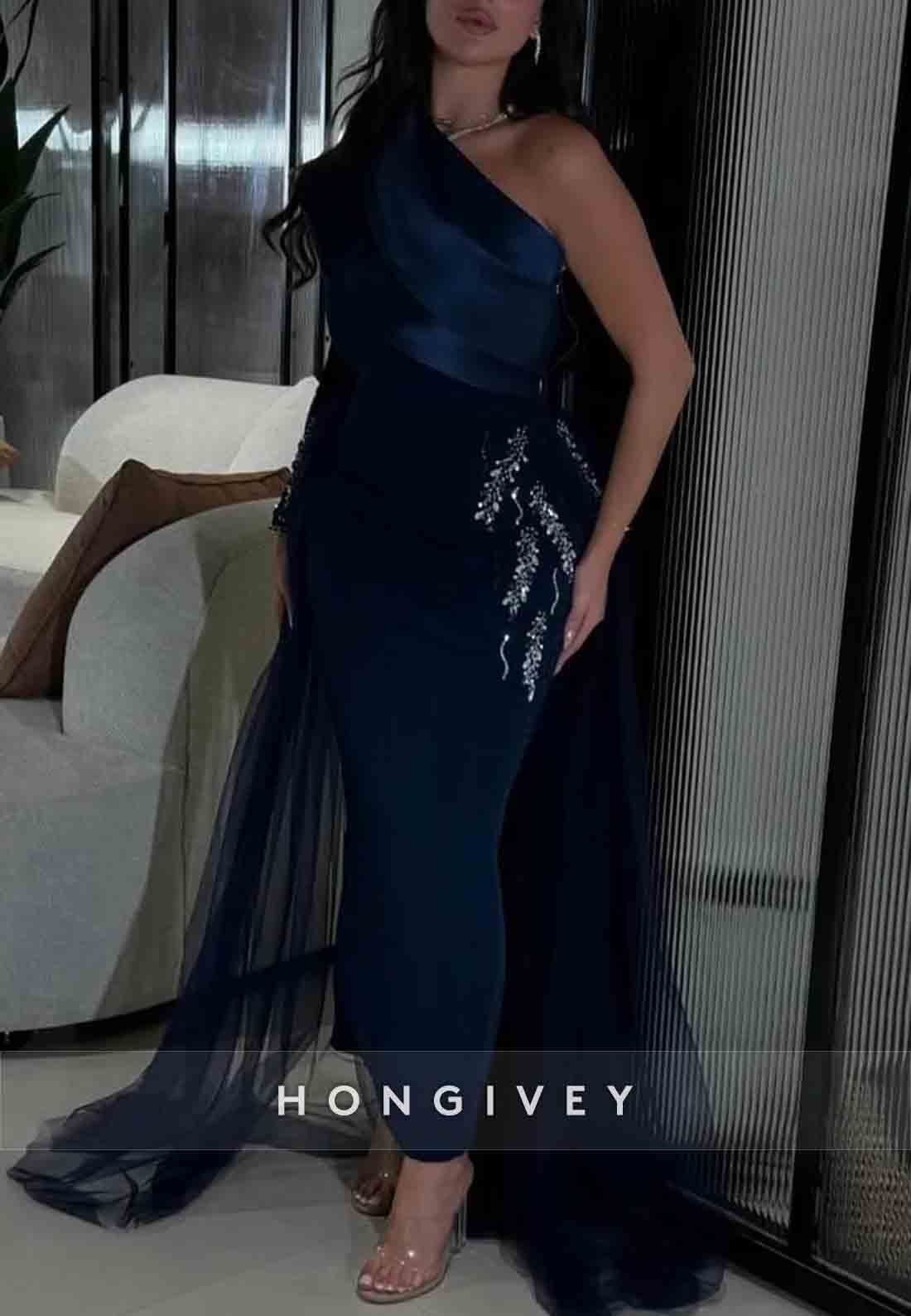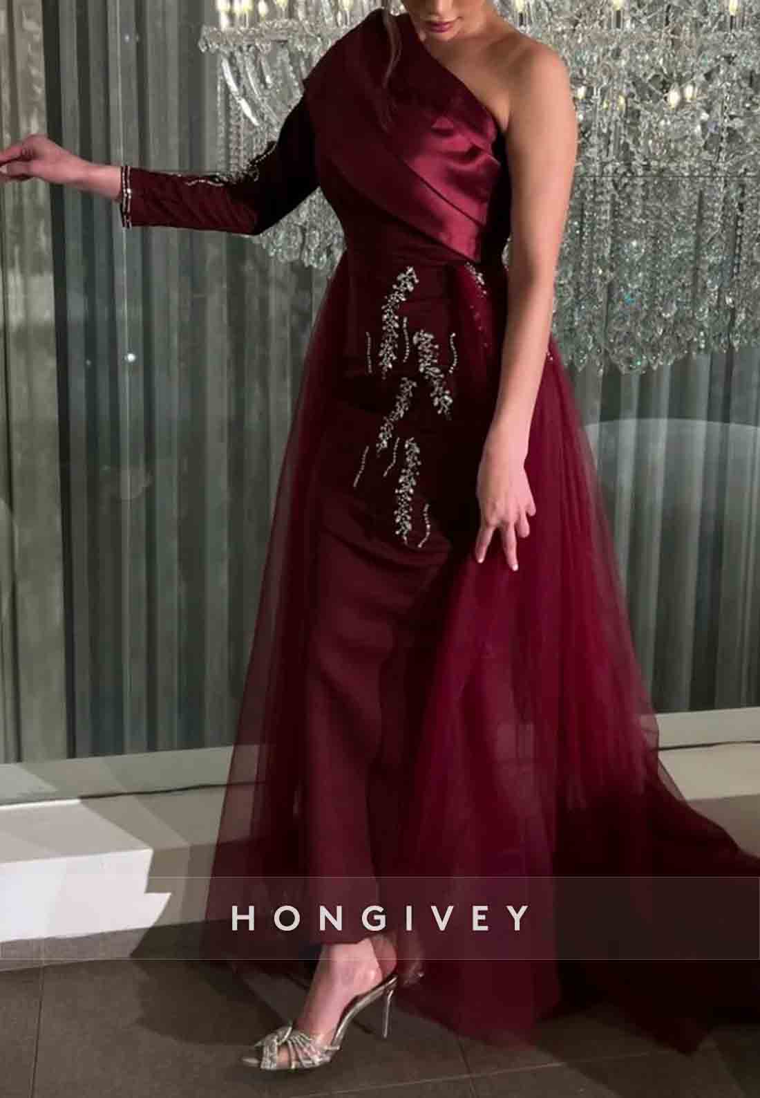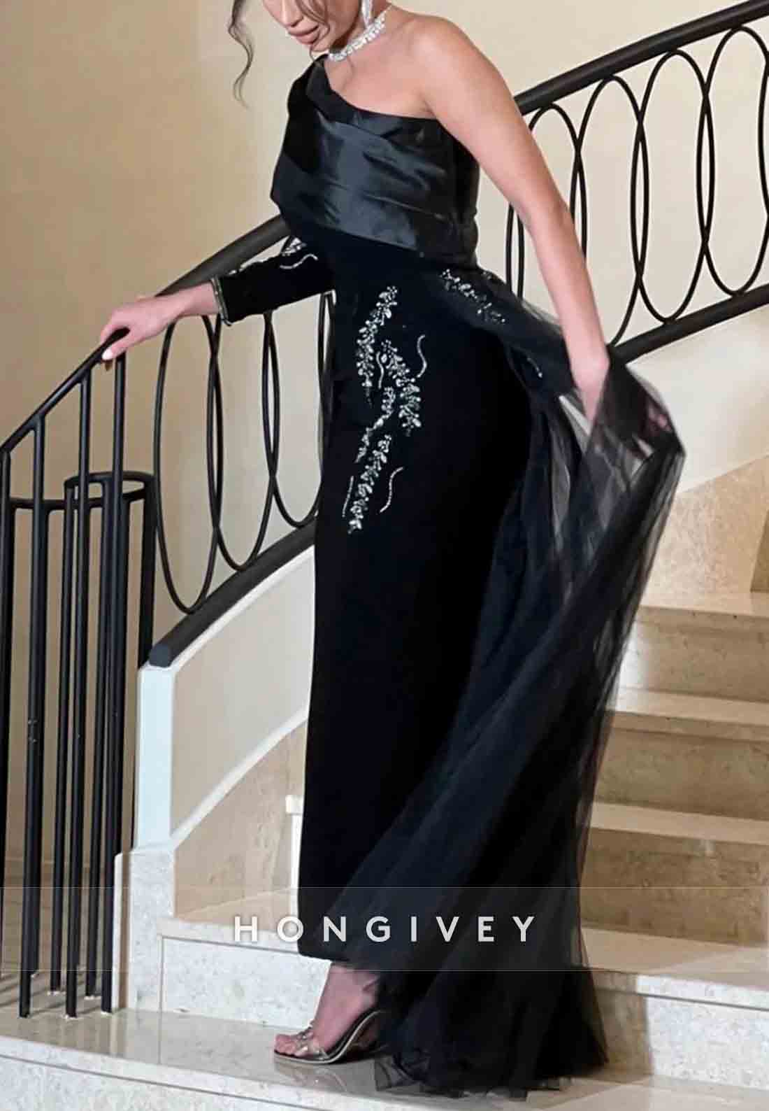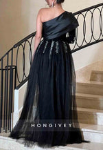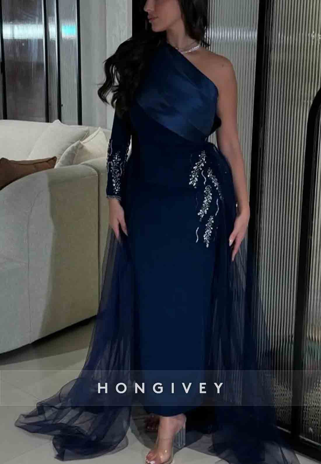 Elevate your formal ensemble with this exquisite A-line evening gown. Crafted from delicate tulle with a sophisticated one-shoulder design, this dress features elegant pleating and intricate appliqué detailing. The long sleeve silhouette offers refined coverage while maintaining a graceful aesthetic, perfect for galas, formal receptions, or any prestigious evening affair where timeless elegance is essential.