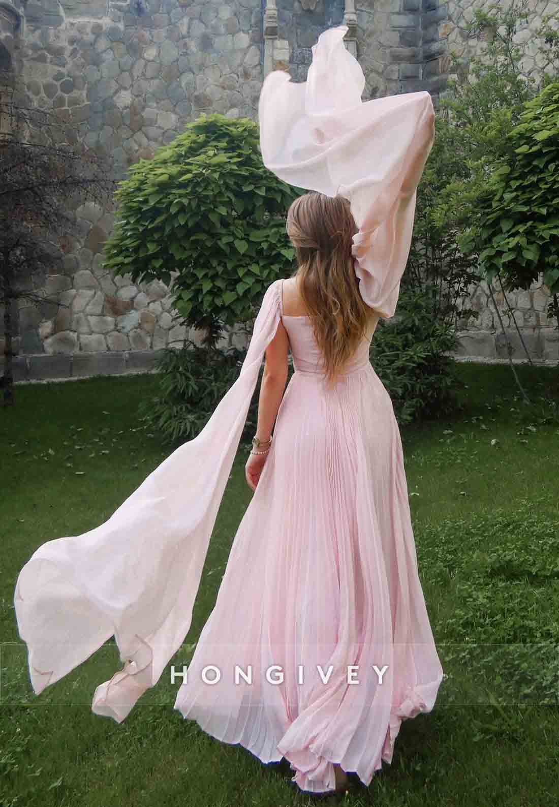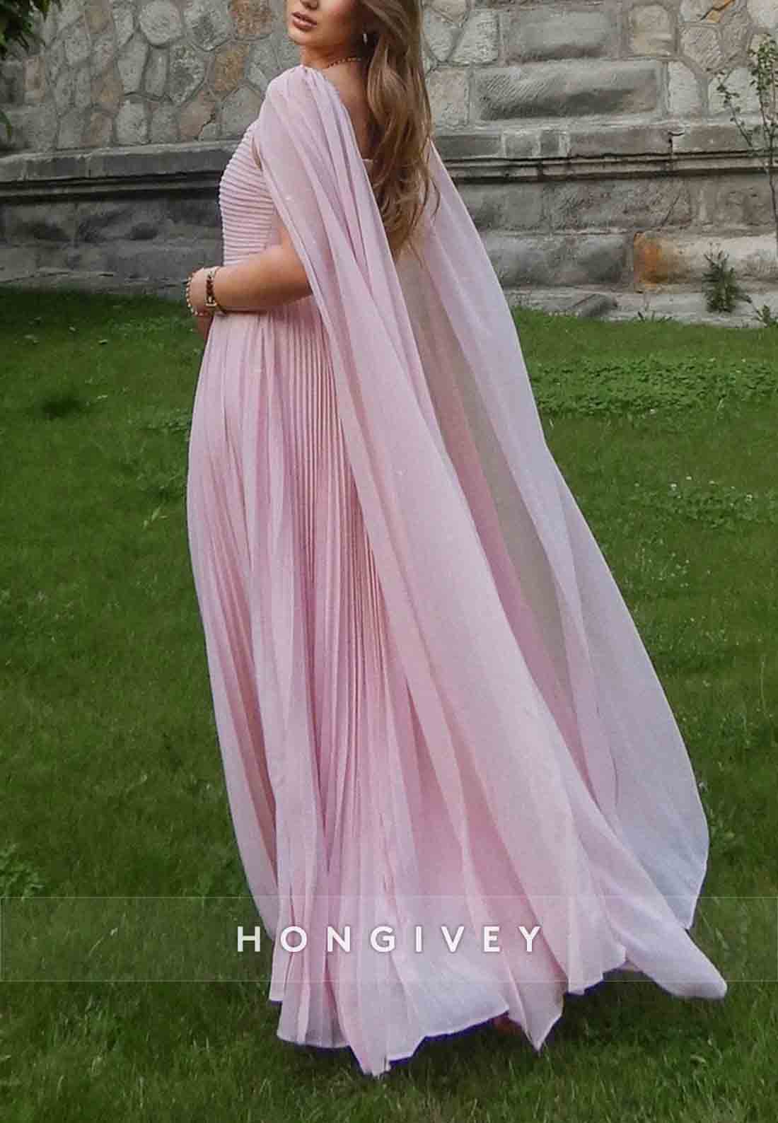 This floor-length A-line gown combines delicate pleats with elegant ruffles, creating a refined silhouette perfect for wedding guests. Its graceful design offers both movement and sophistication, ensuring you look effortlessly polished at any formal celebration.