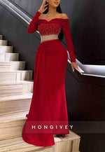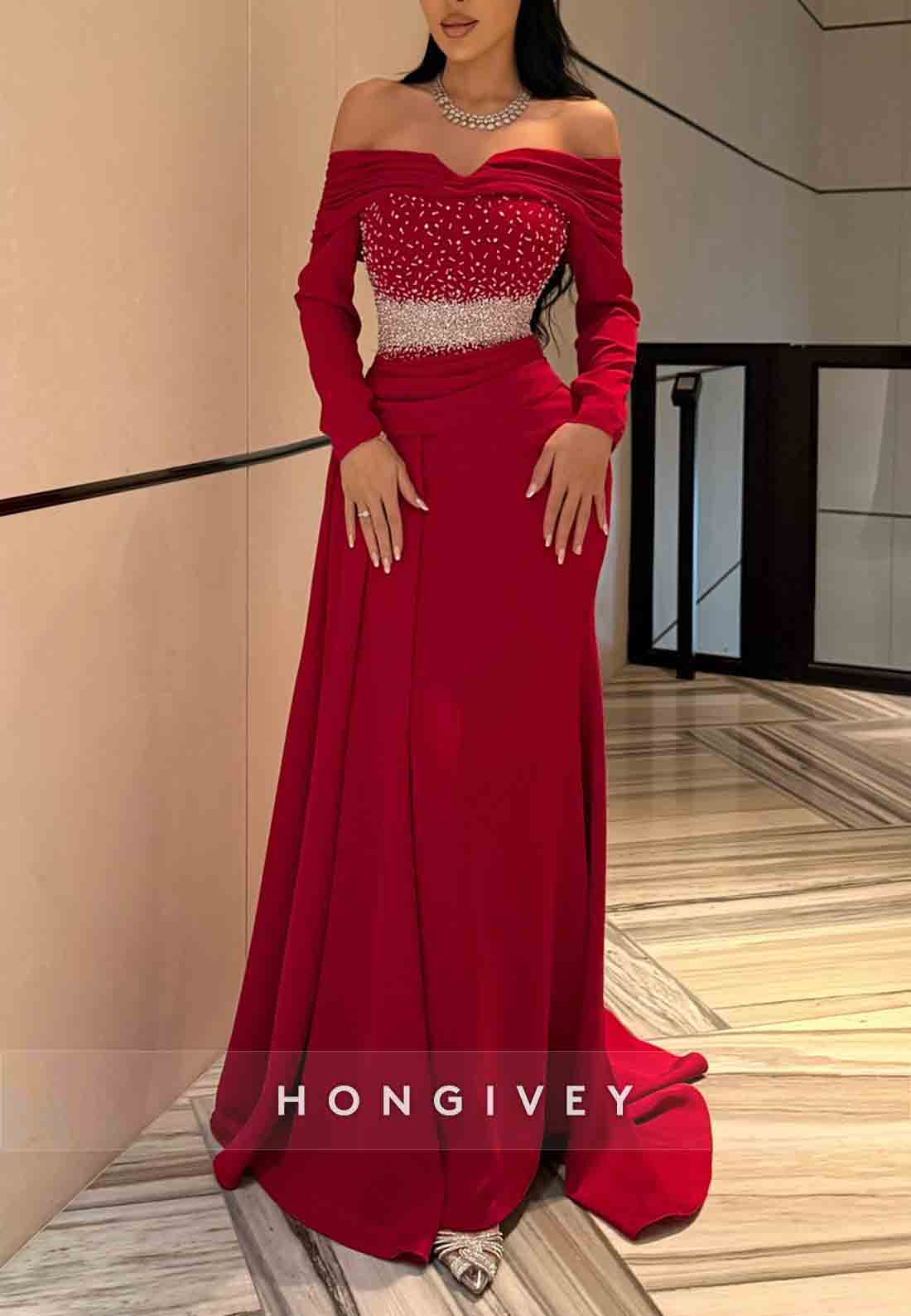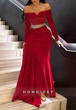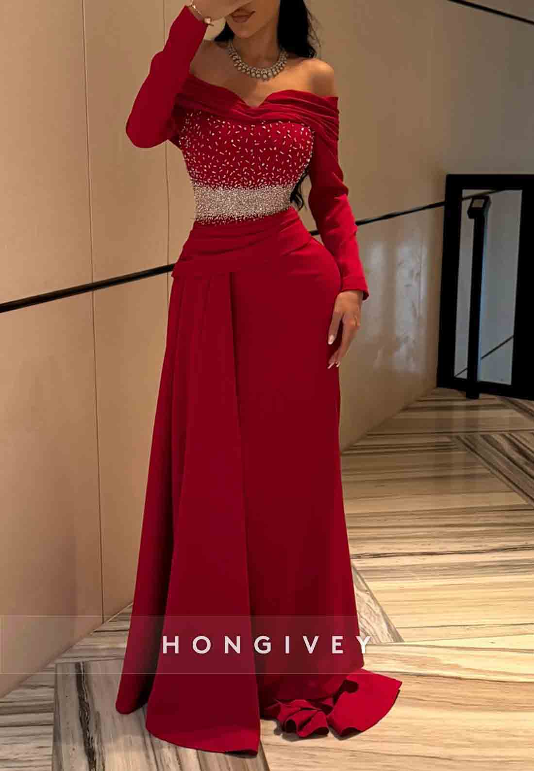 Long Sleeves Side Draping Off the Shoulder Floor-Length Pleated Evening Gowns