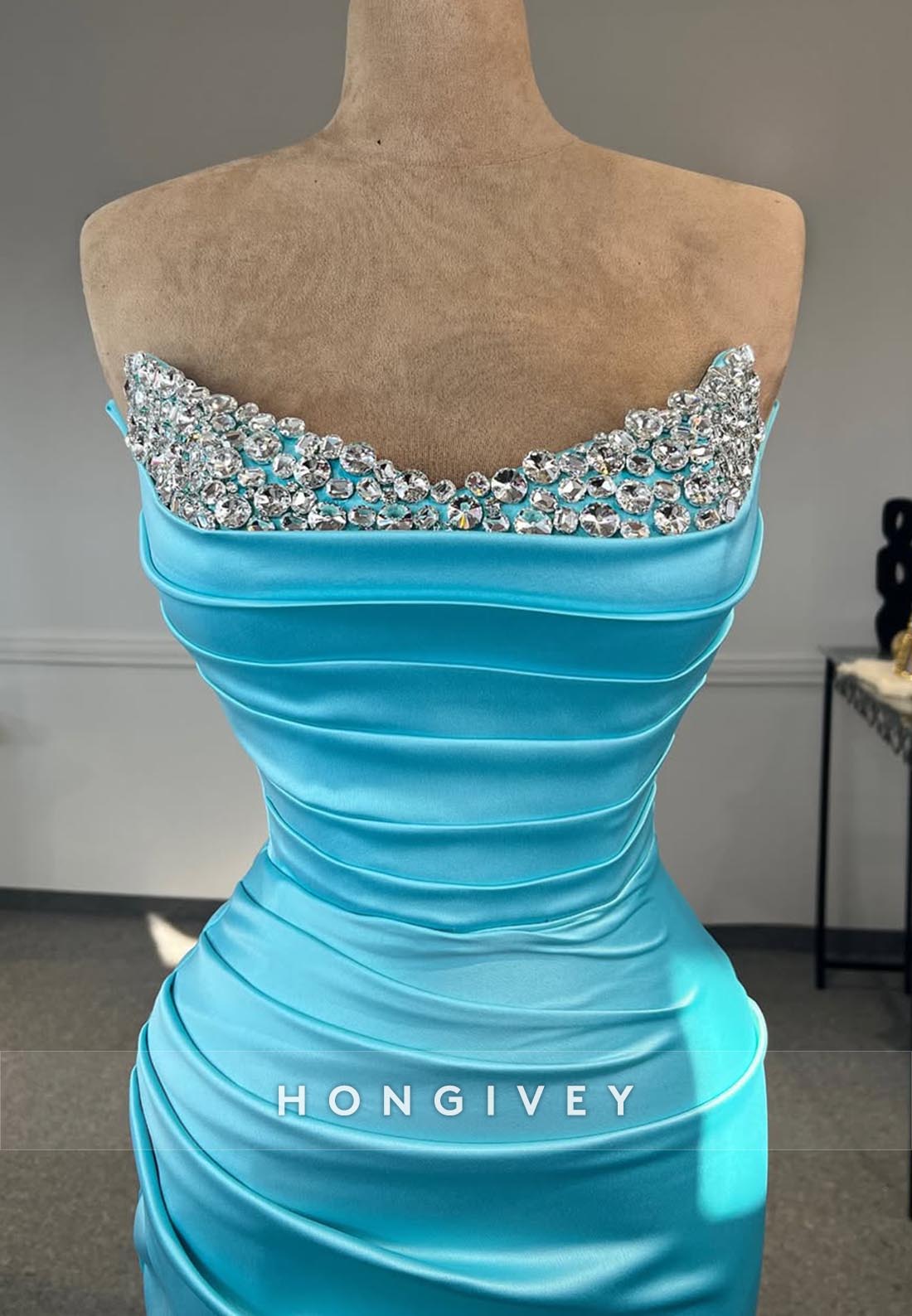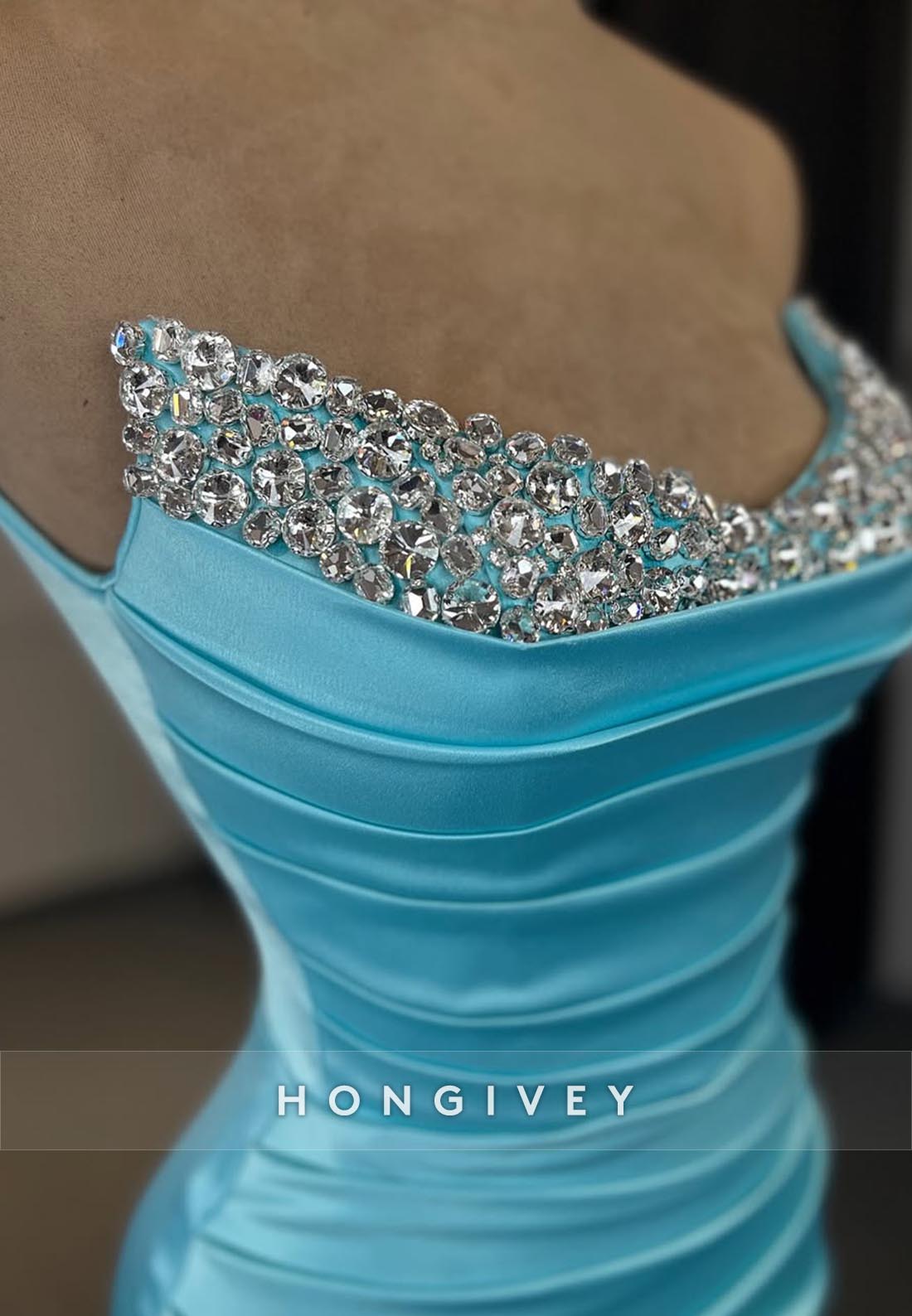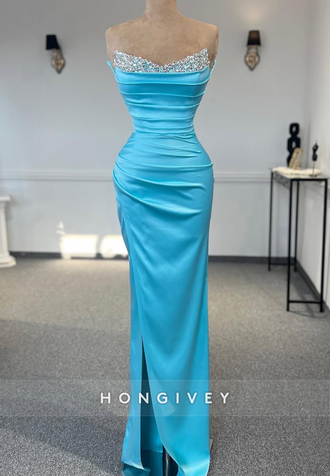 V-Neck Rhinestone Draped Mermaid Long Prom Dresses with High Slit
