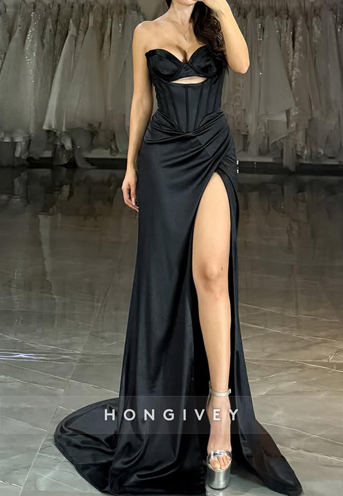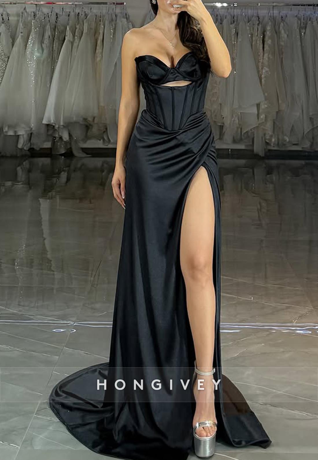 Black Sweetheart Ruched High Slit Sexy Prom Dresses with Brush Train