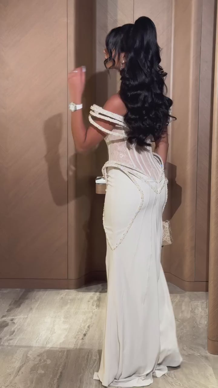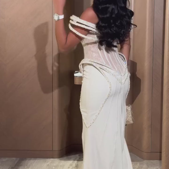 This off-the-shoulder trumpet gown combines intricate lace detailing with a floor-length silhouette that elegantly contours your figure. The subtle slit adds a touch of allure while maintaining a polished, sophisticated presence. Ideal for formal occasions, this gown blends classic romance with modern refinement.
