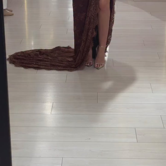 This exquisite chocolate prom dress epitomizes timeless sophistication. The strapless silhouette showcases intricate lace detailing across the bodice, while a sweeping court train creates an air of refined elegance. A tasteful high slit provides graceful movement and modern allure without compromising the dress's dignified aesthetic. Crafted for the discerning guest who appreciates understated luxury and impeccable tailoring, this gown ensures you'll command the room with poise and style.