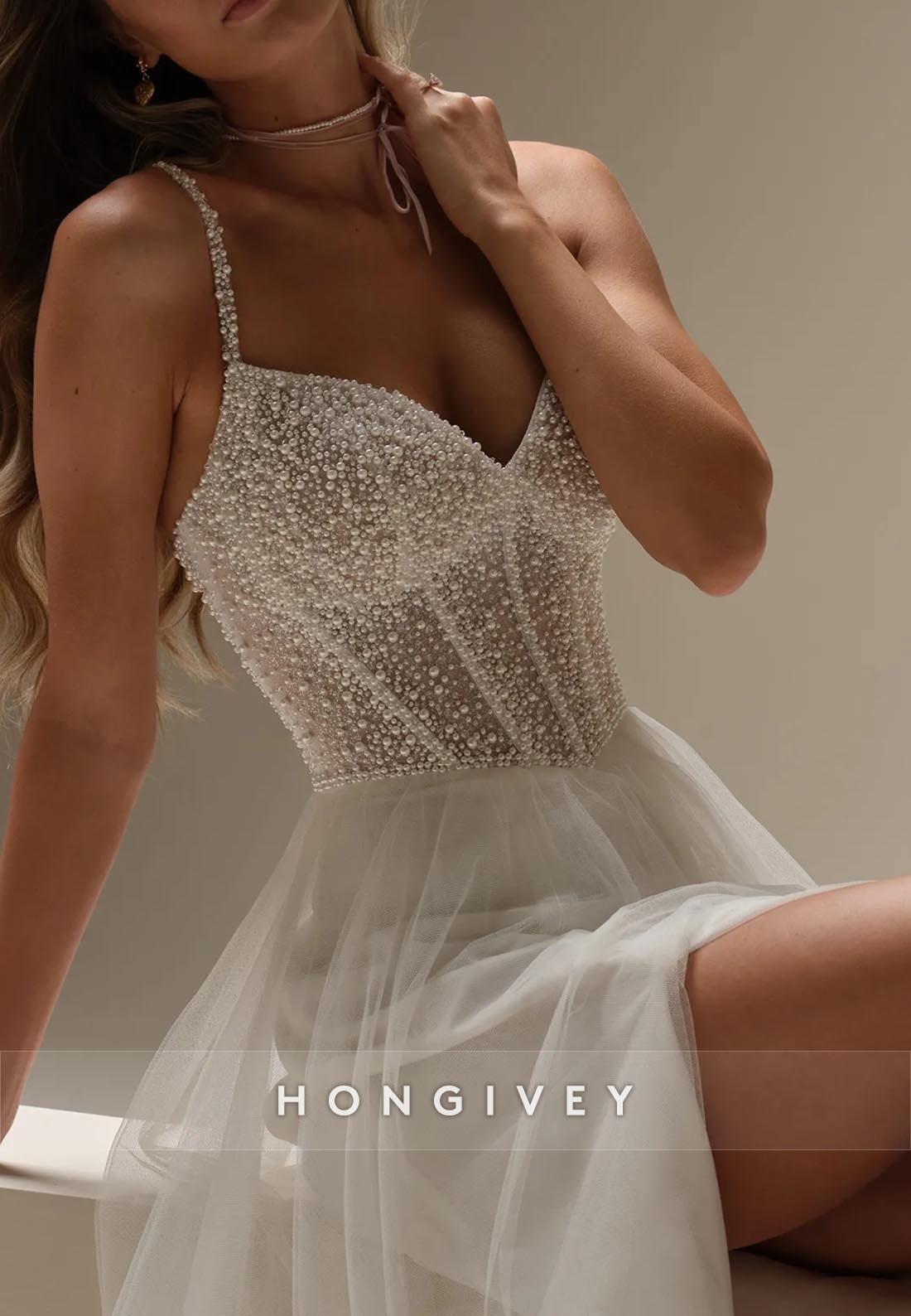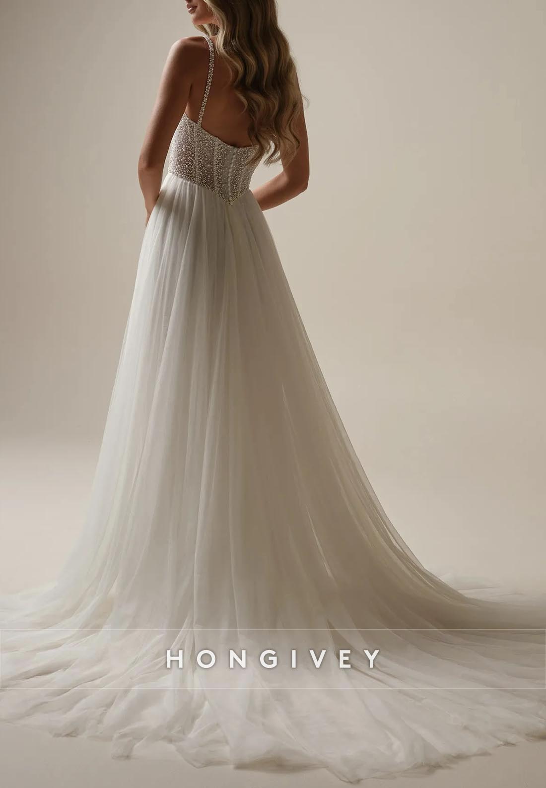 Low Back Beading Spaghetti Straps Tulle Sweetheart Chapel Train Princess Boho Wedding Dresses