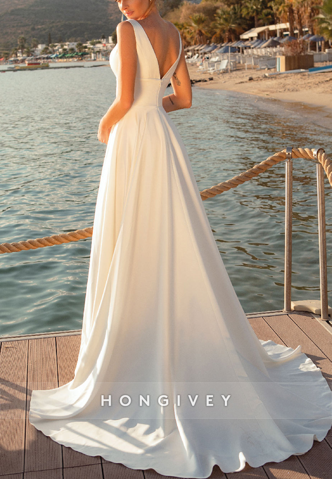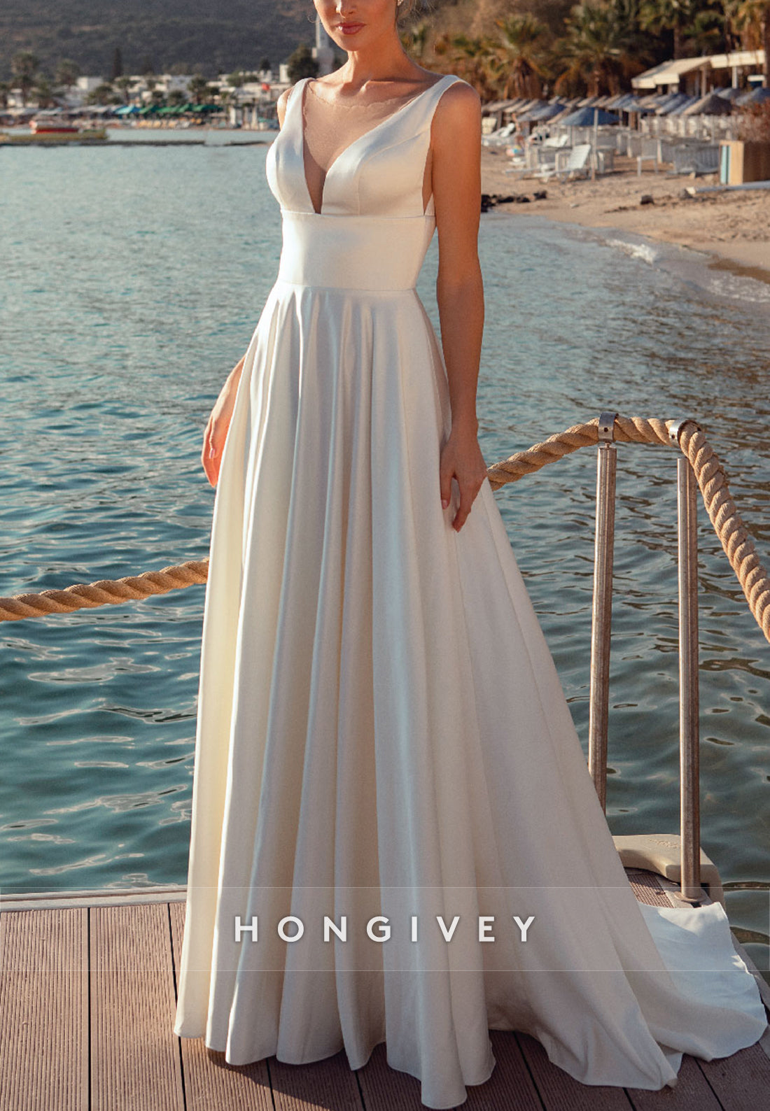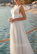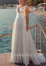 V Neck A-line Pleated Satin Sweep Train Cap Straps V Back Wedding Dresses