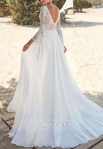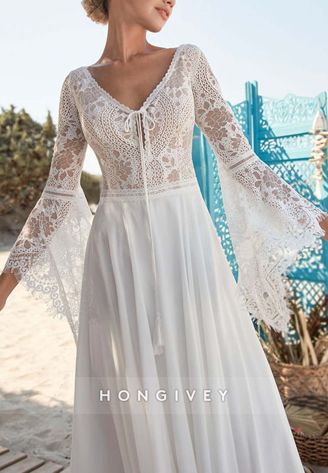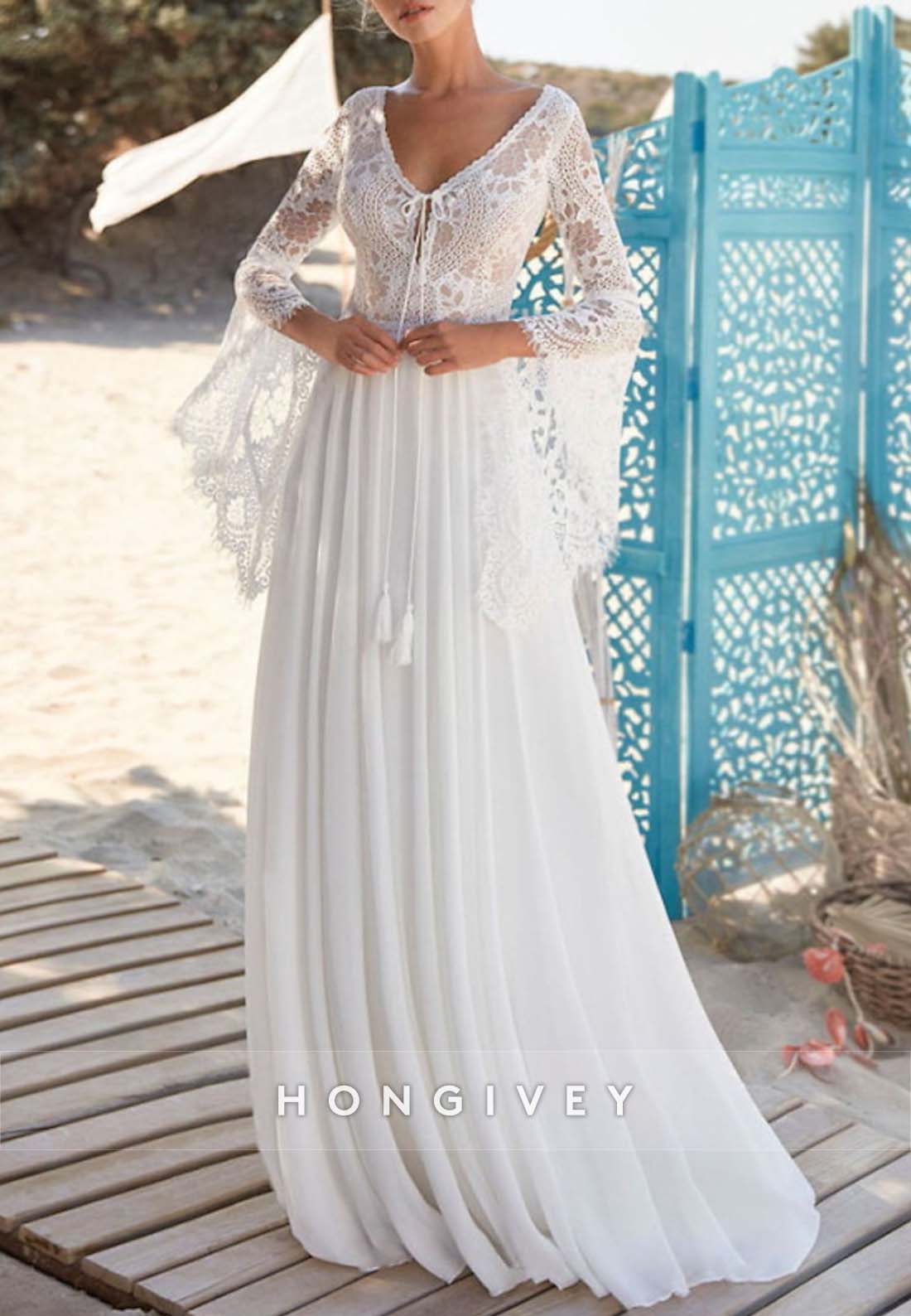 V Back Pleated Lace Sweep Train V Neck Flutter Sleeves Boho Wedding Dresses