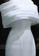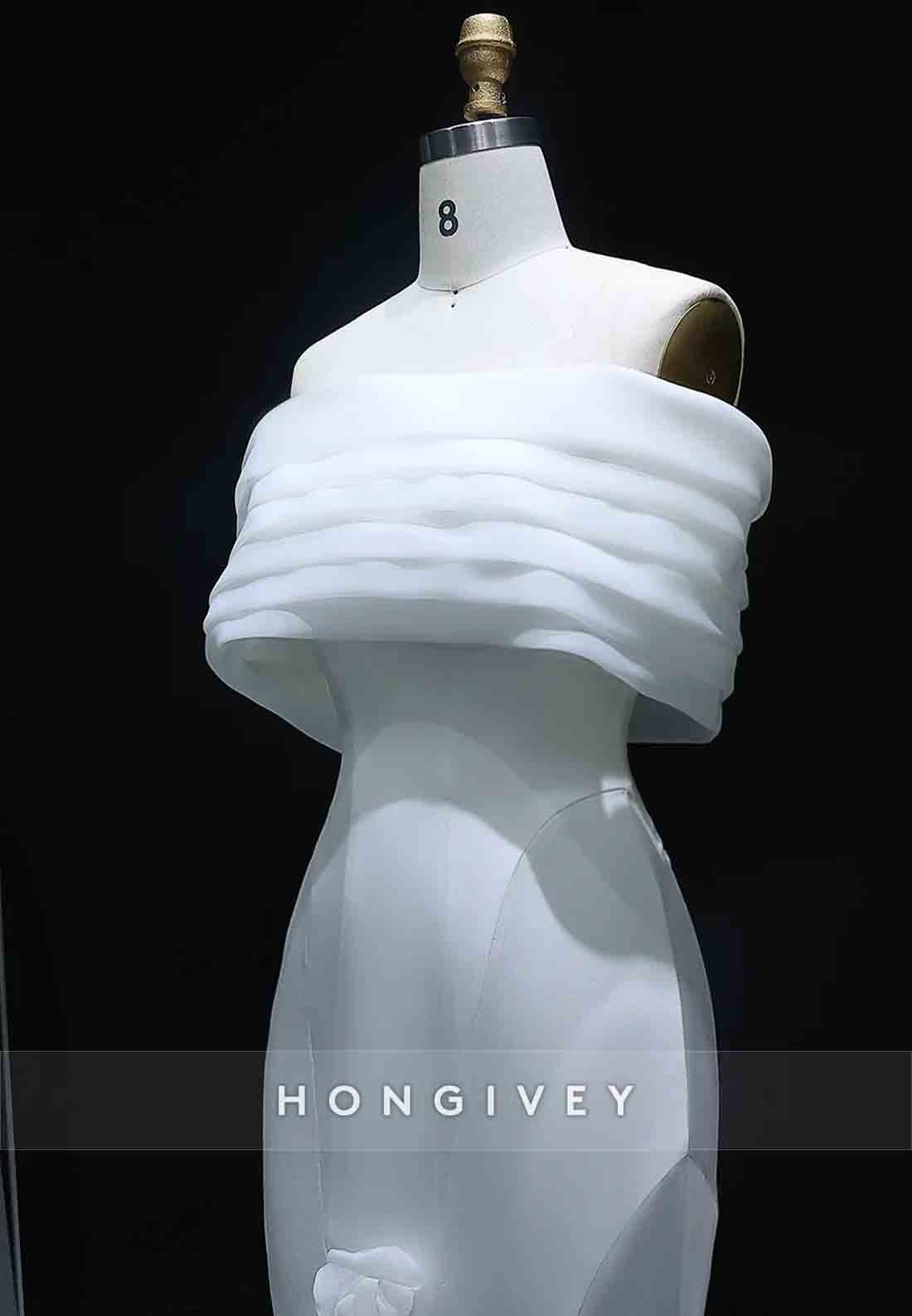 This exquisite mermaid gown embodies refined elegance with its graceful off-shoulder shawl adorned with delicate floral embellishments. The meticulously tailored silhouette follows your contours before cascading into a magnificent sweep train, creating a sophisticated profile that commands attention. An artful balance of timeless romance and contemporary allure for the discerning bride.