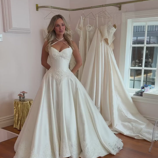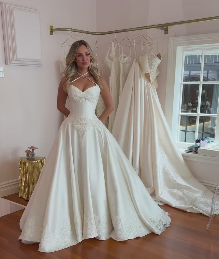 This sophisticated satin A-line gown features a striking cross-neck halter design that elegantly frames the neckline. The empire waist enhances your silhouette while the court-length train offers graceful movement. Delicate lace trim adds a refined touch of texture, blending classic elegance with modern style for the discerning bride.