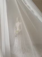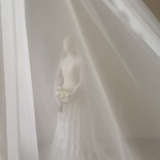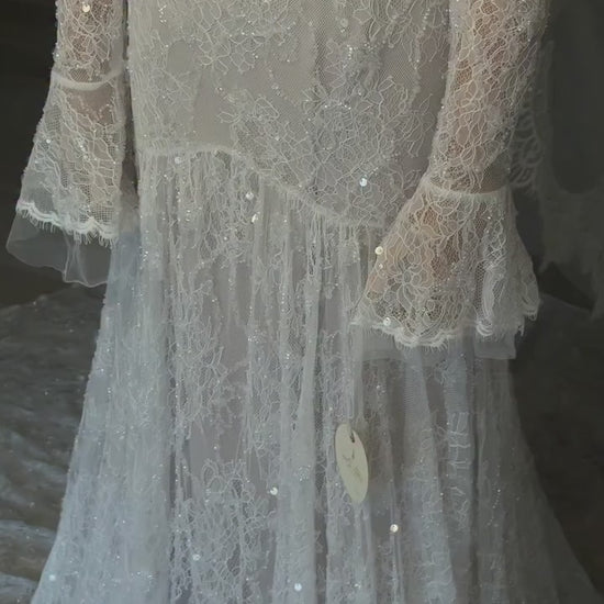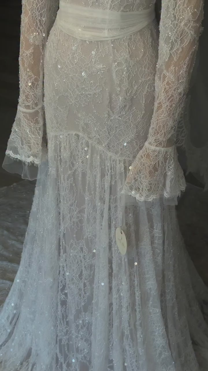 Make a radiant statement in this glamorous sequined wedding gown. Shimmering beadwork adorns the long sleeves and empire waistline, catching light with every movement for an enchanting effect. The trumpet silhouette elegantly hugs the curves before flaring gracefully at the hem, creating a striking and feminine profile. This sophisticated design merges sparkle with refinement, offering the perfect balance of drama and elegance for a bride who desires both luminosity and timeless grace on her wedding day.