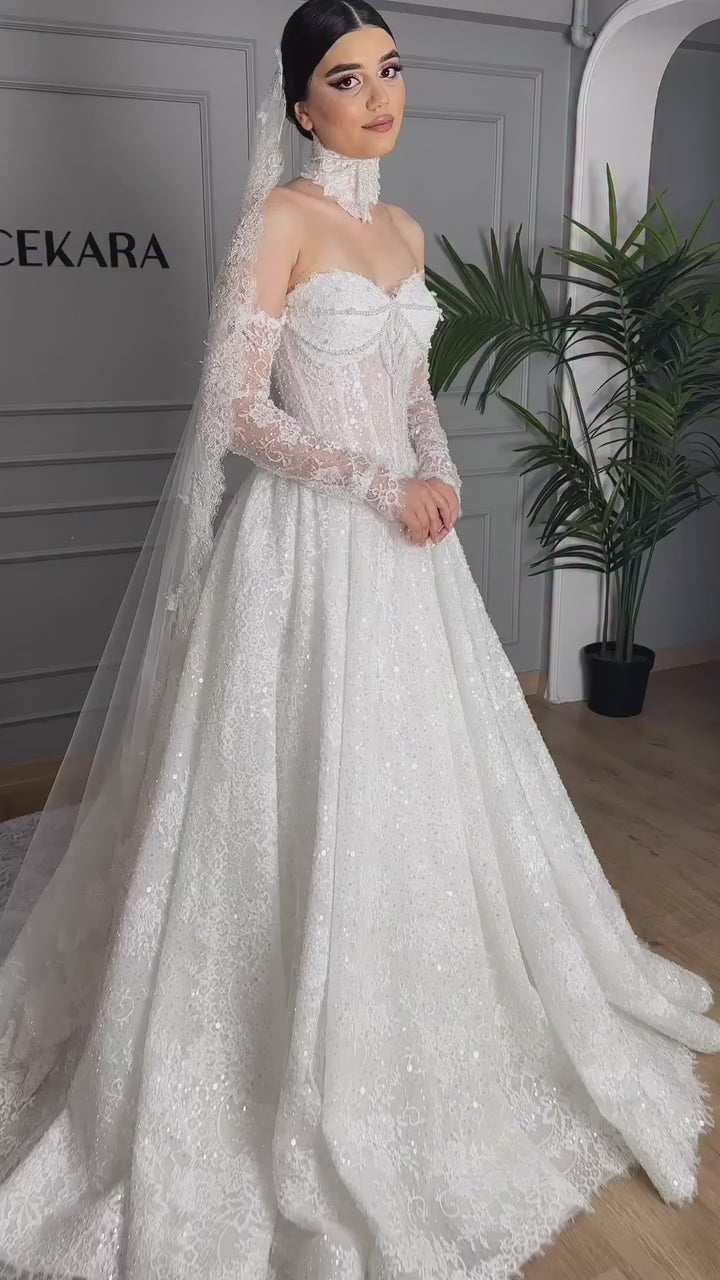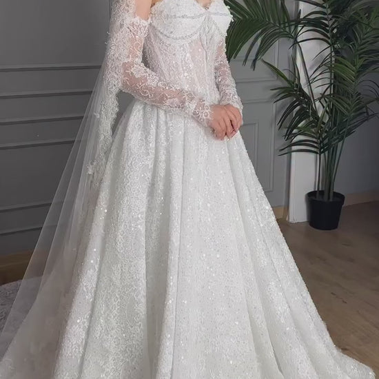 This exquisite A-line wedding dress combines graceful femininity with refined elegance. Delicate lace adorns the bodice and flows seamlessly down the skirt, while pearl embellishments add subtle luxury and dimension. The off-the-shoulder sweetheart neckline frames the face beautifully, and long sleeves provide sophisticated coverage. Perfect for the discerning bride who values timeless design and intricate craftsmanship, this gown promises an enchanting walk down the aisle.