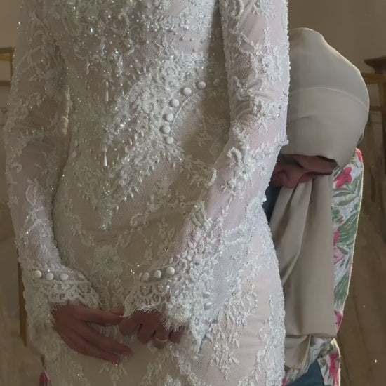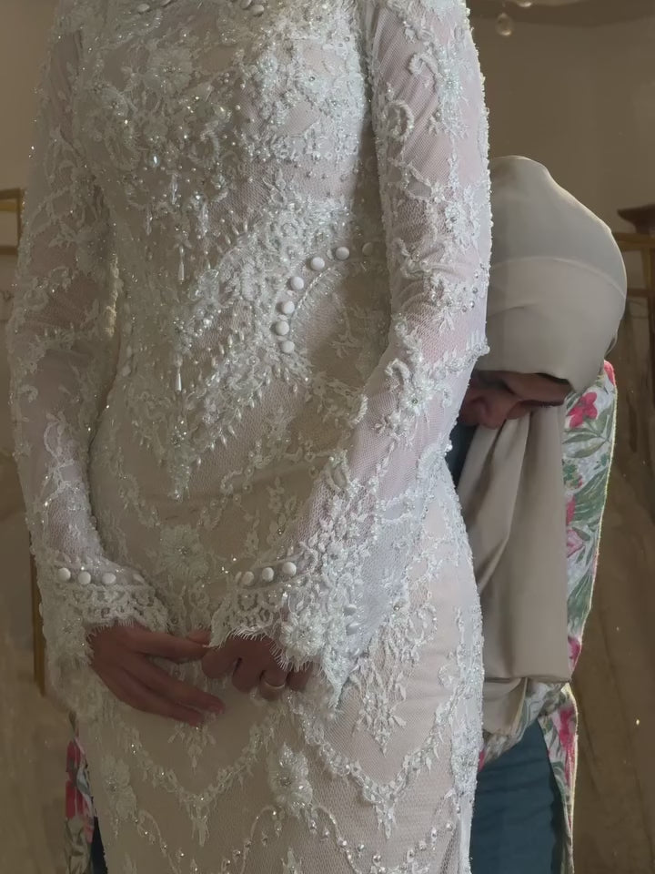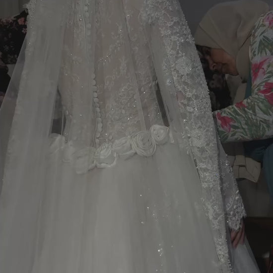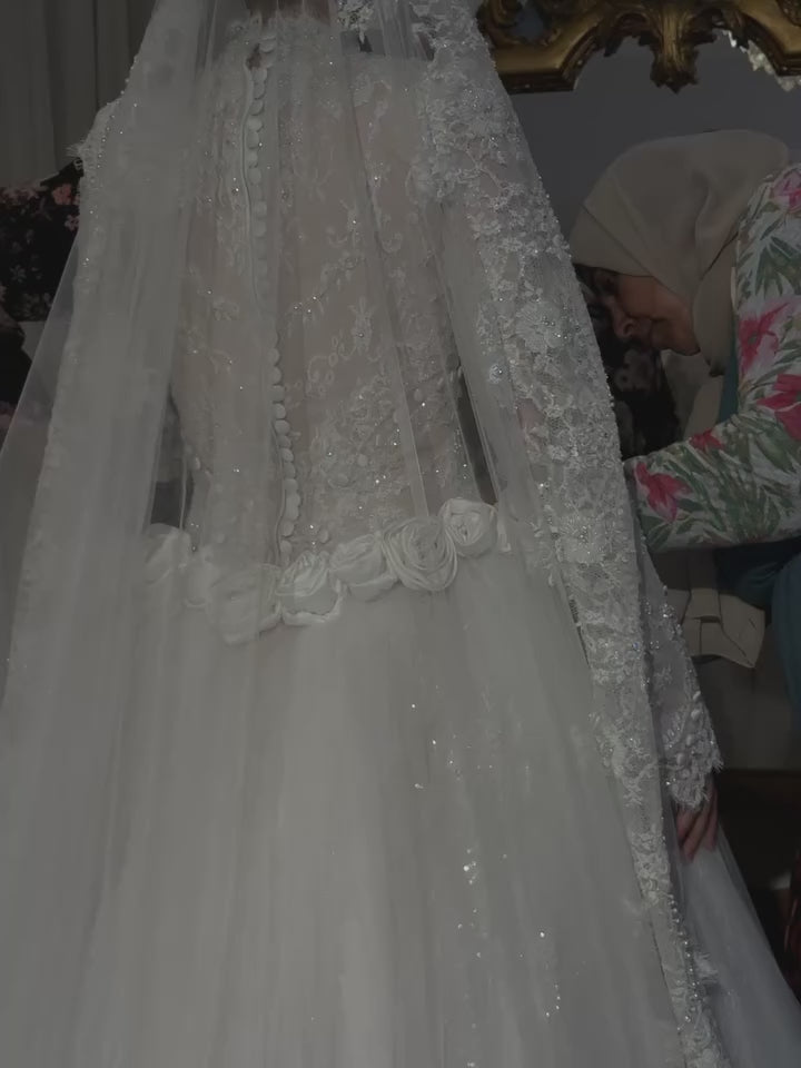 Experience ethereal romance in this exquisite bridal gown featuring a refined high neckline and graceful long sleeves. Delicate tulle forms the foundation, while intricate beaded lace and dimensional 3D floral appliqués create an enchanting textural landscape across the bodice and skirt. Each hand-crafted flower adds depth and movement, elevating the design with artistic sophistication. This gown seamlessly blends classical elegance with contemporary artistry, making it an unforgettable choice for the bride seeking a truly distinctive and memorable wedding day look.