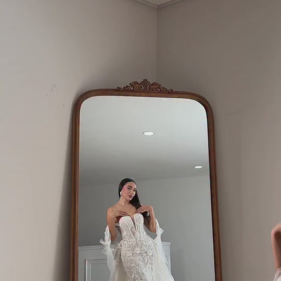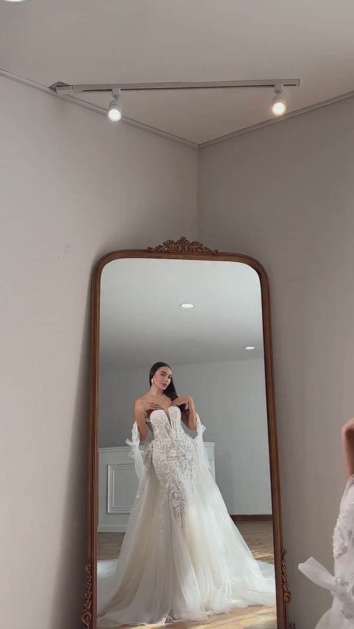 Exude timeless femininity in this exquisite mermaid wedding dress, featuring an off-the-shoulder neckline that elegantly showcases the collarbone. Delicate appliqués adorned with intricate tulle detailing create a romantic, textured aesthetic throughout the gown. A charming bowknot accent adds a touch of whimsy and refined detail. The detachable design offers versatility, allowing you to transition seamlessly from ceremony to reception. This sophisticated silhouette celebrates curves while maintaining an air of understated elegance, making it the perfect choice for a bride seeking both grace and glamour.