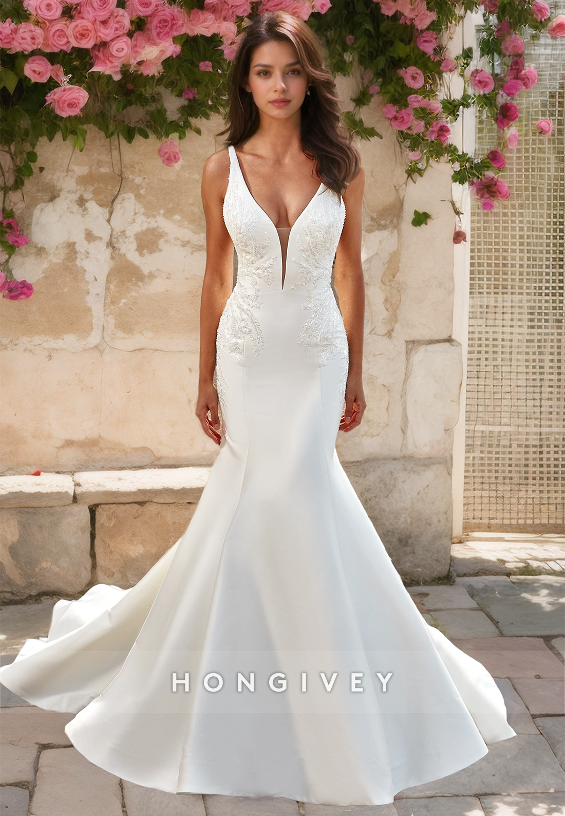 Look stunning in our H1379 Wedding Dress! Crafted in a Luxurious Satin Trumpet with an eye-catching V-Neckline and figure hugging Straps, this dress is adorned with beaded appliques and sweeping train for a truly romantic style. Perfect for making a statement on your big day.
