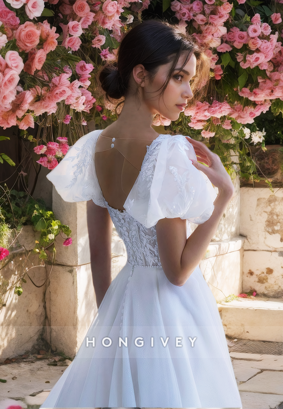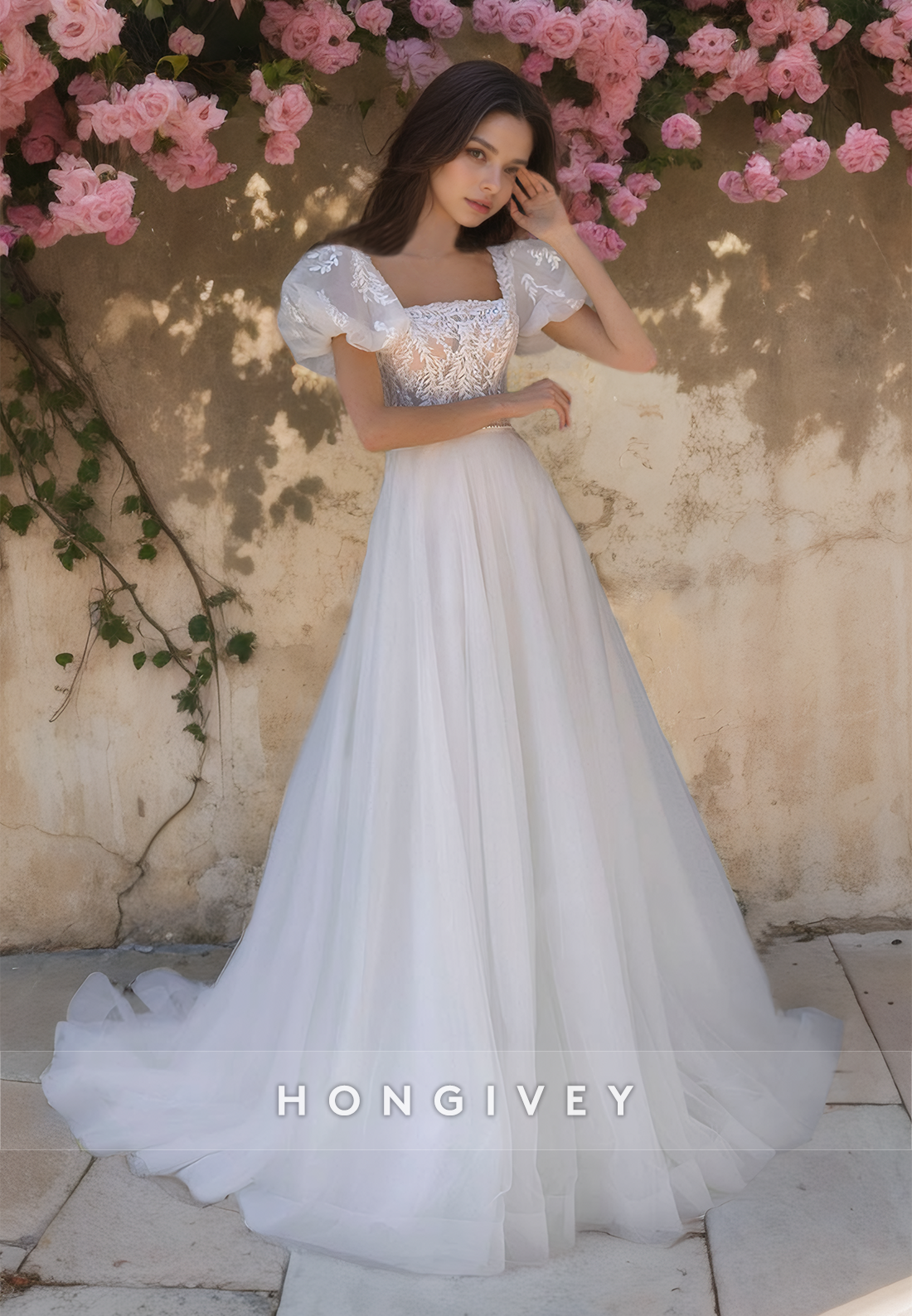 This Sweet Square Short Sleeves A-Line Applique Tulle Wedding Dress by New HONGIVEY features delicate appliques and a flattering A-line silhouette. The square neckline and short sleeves add a touch of elegance, making it the perfect choice for a memorable and stylish wedding day.